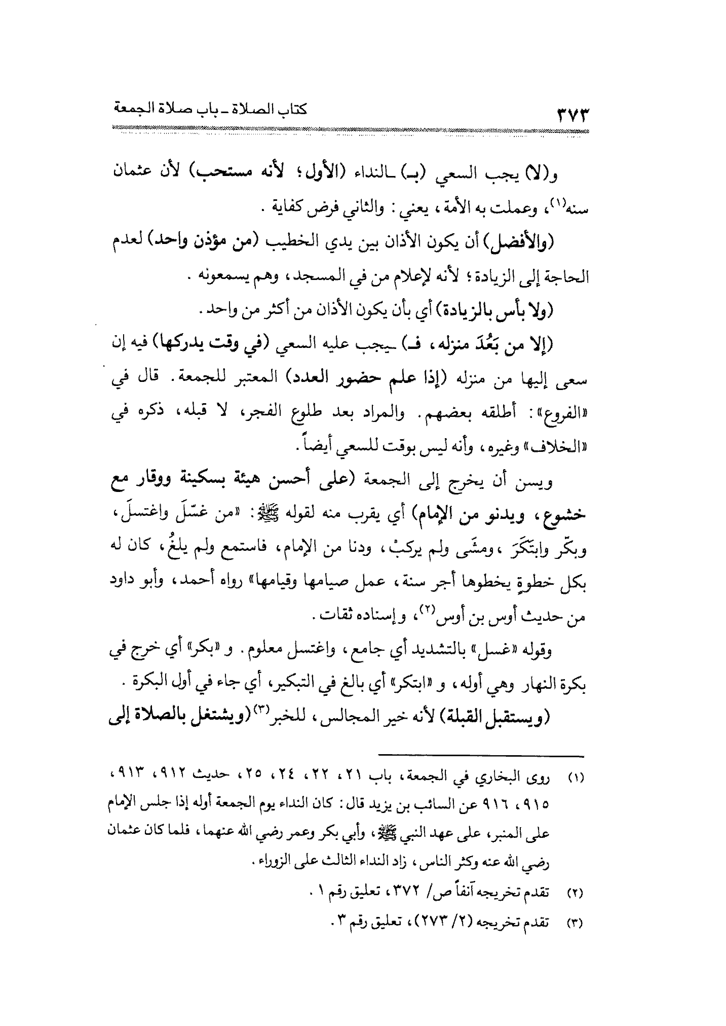 (¬١) روى البخاري في الجمعة، باب ٢١، ٢٢، ٢٤، ٢٥، حديث ٩١٢، ٩١٣، ٩١٥، ٩١٦ عن السائب بن يزيد قال: كان النداء يوم الجمعة أوله إذا جلس الإمام على المنبر، على عهد النبي - صلى الله عليه وسلم -، وأبي بكر وعمر رضي الله عنهما، فلما كان عثمان رضي الله عنه وكثر الناس، زاد النداء الثالث على الزوراء.