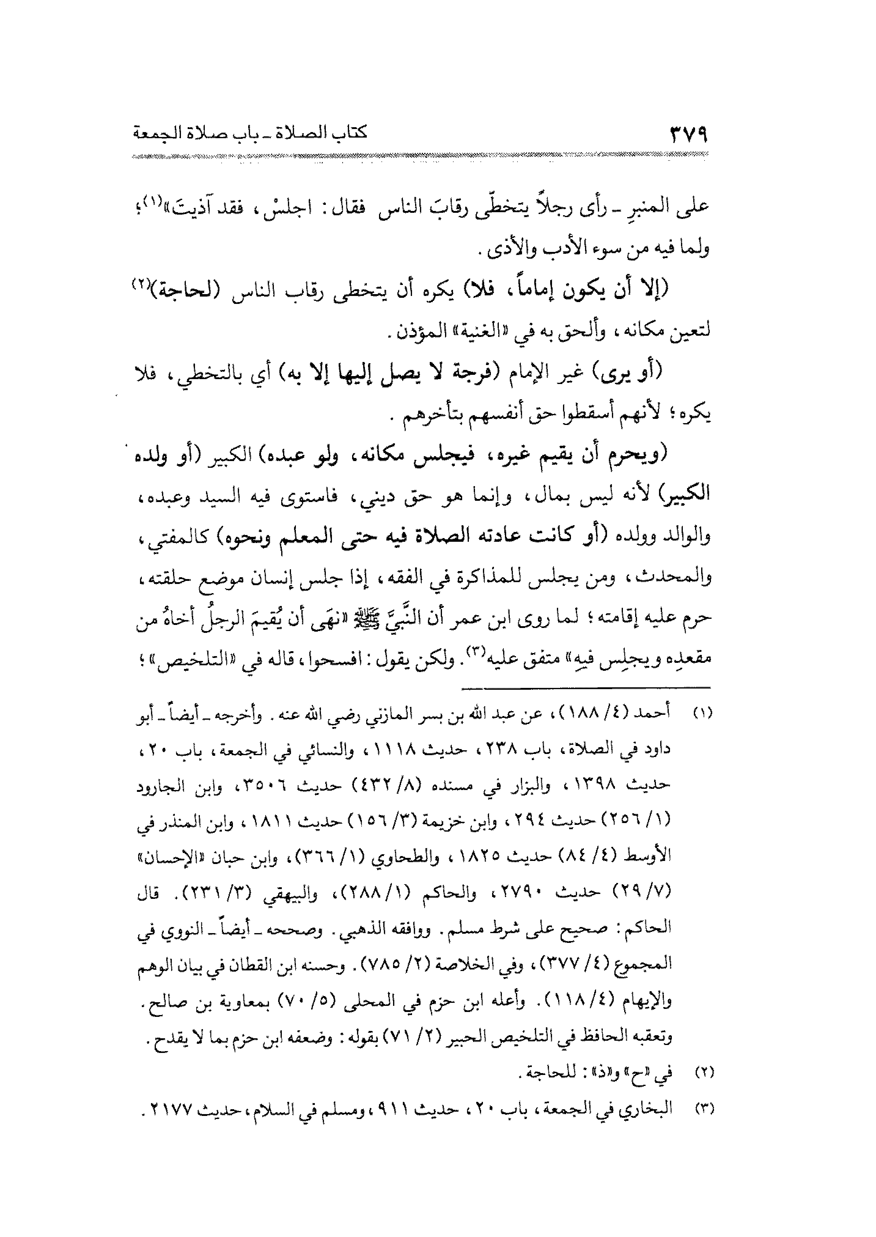 على المنبرِ- رأى رجلًا يتخطّى رقابَ الناس فقال: اجلسْ، فقد آذيتَ" (¬١)؛ ولما فيه من سوء الأدب والأذى.