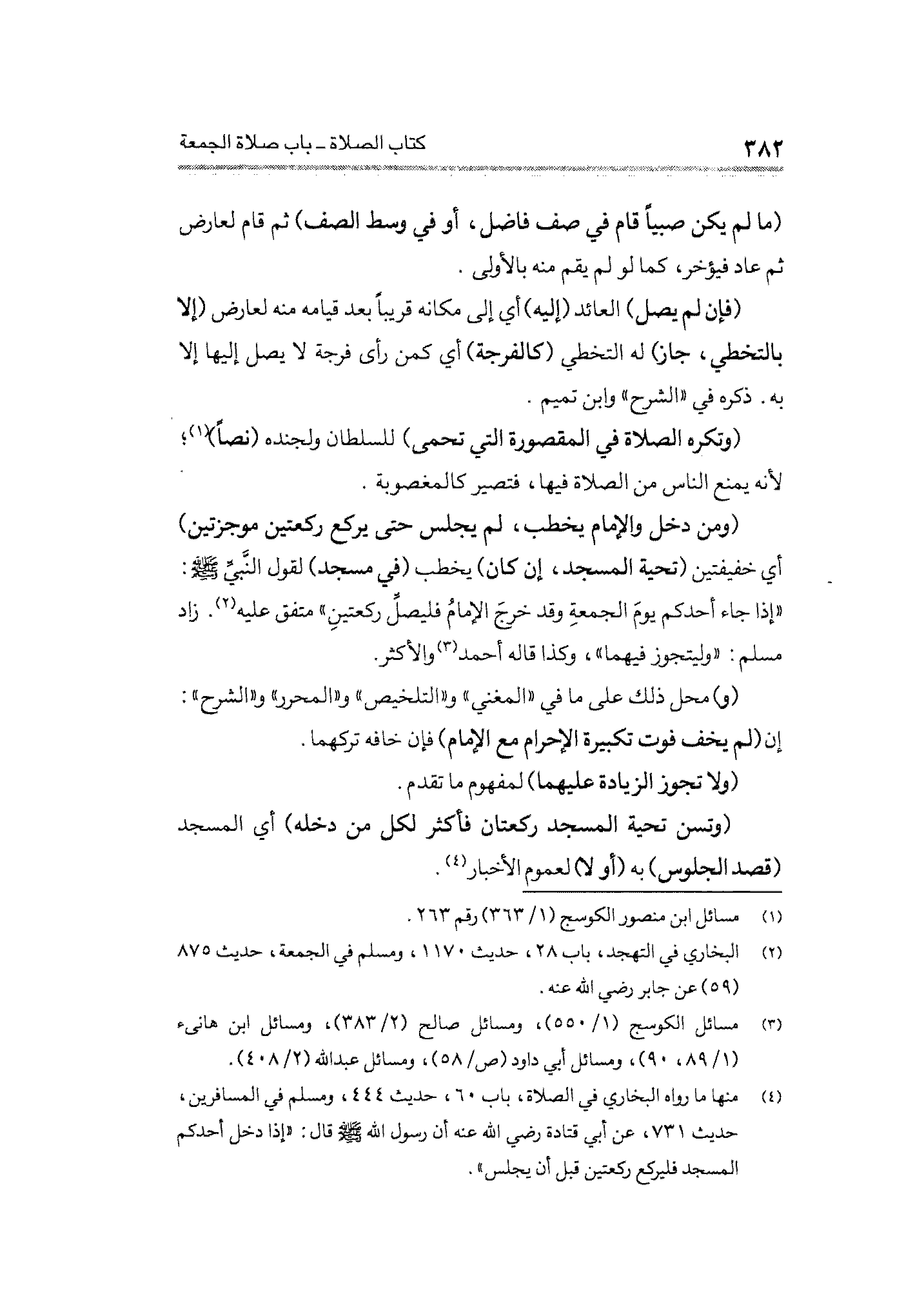 (ومن دخل والإمام يخطب، لم يجلس حتى يركع ركعتين موجزتين) أي خفيفتين (تحية المسجد، إن كان) يخطب (في مسجد) لقول النبي - صلى الله عليه وسلم -: "إذا جاء أحدكم يومَ الجمعةِ وقد خرجَ الإمامُ فليصل ركعتينِ" متفق عليه (¬٢). زاد مسلم: "وليتجوز فيهما"، وكذا قاله أحمد (¬٣) والأكثر.