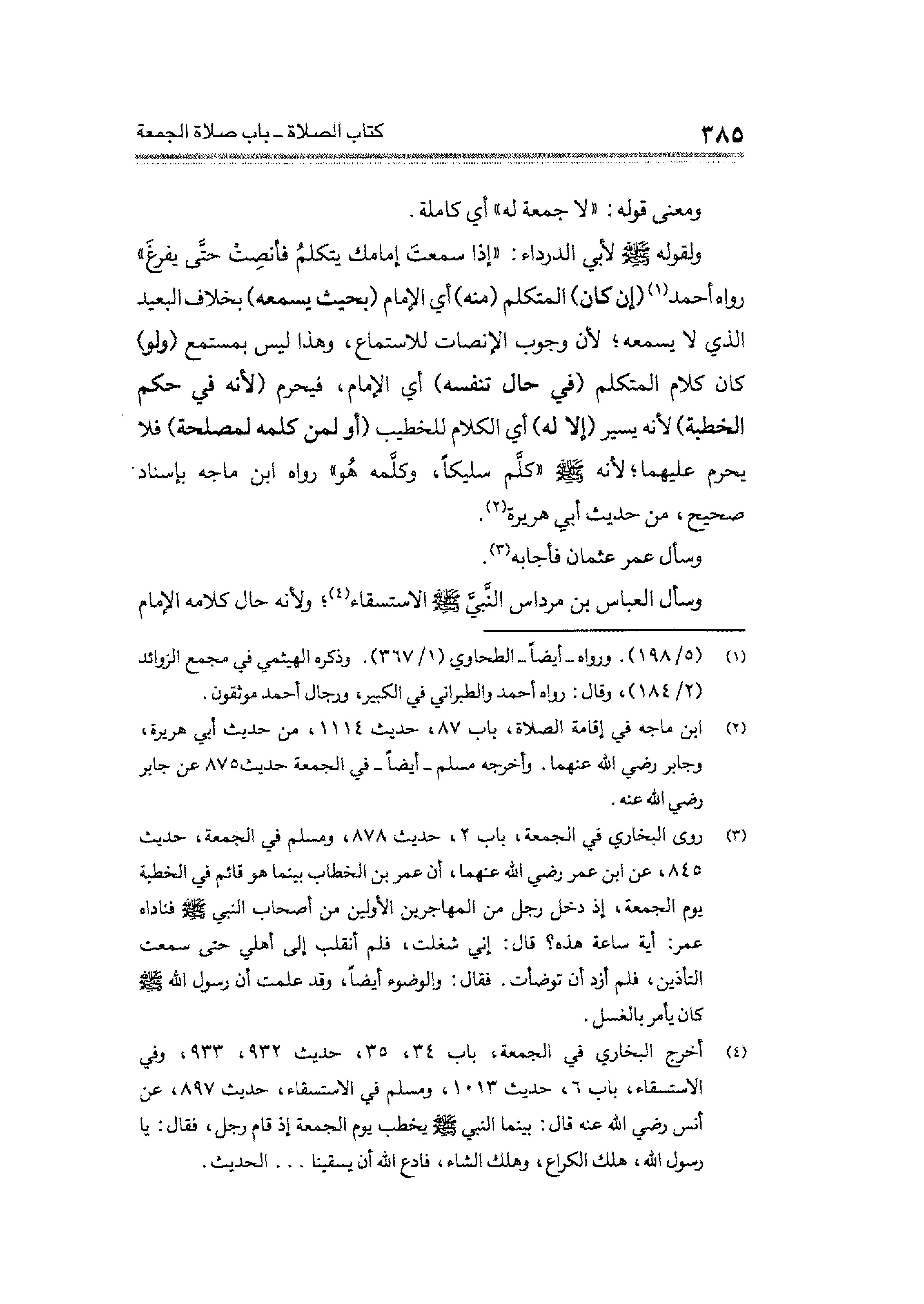 (¬٣) روى البخاري في الجمعة، ياب ٢، حديث ٨٧٨، ومسلم في الجمعة، حديث ٨٤٥، عن ابن عمر رضي الله عنهما، أن عمر بن الخطاب بينما هو قائم في الخطبة يوم الجمعة، إذ دخل رجل عن المهاجرين الأولين من أصحاب النبي - صلى الله عليه وسلم - فناداه عمر: أية ساعة هذه؟ قال: إني شغلت، فلم أنقلب إلى أهلي حتى سمعت التأذين، فلم أزد أنه توضأت. فقال: والوضوء أيضًا، وقد علمت أن رسول الله - صلى الله عليه وسلم - كان يأمر بالغسل.