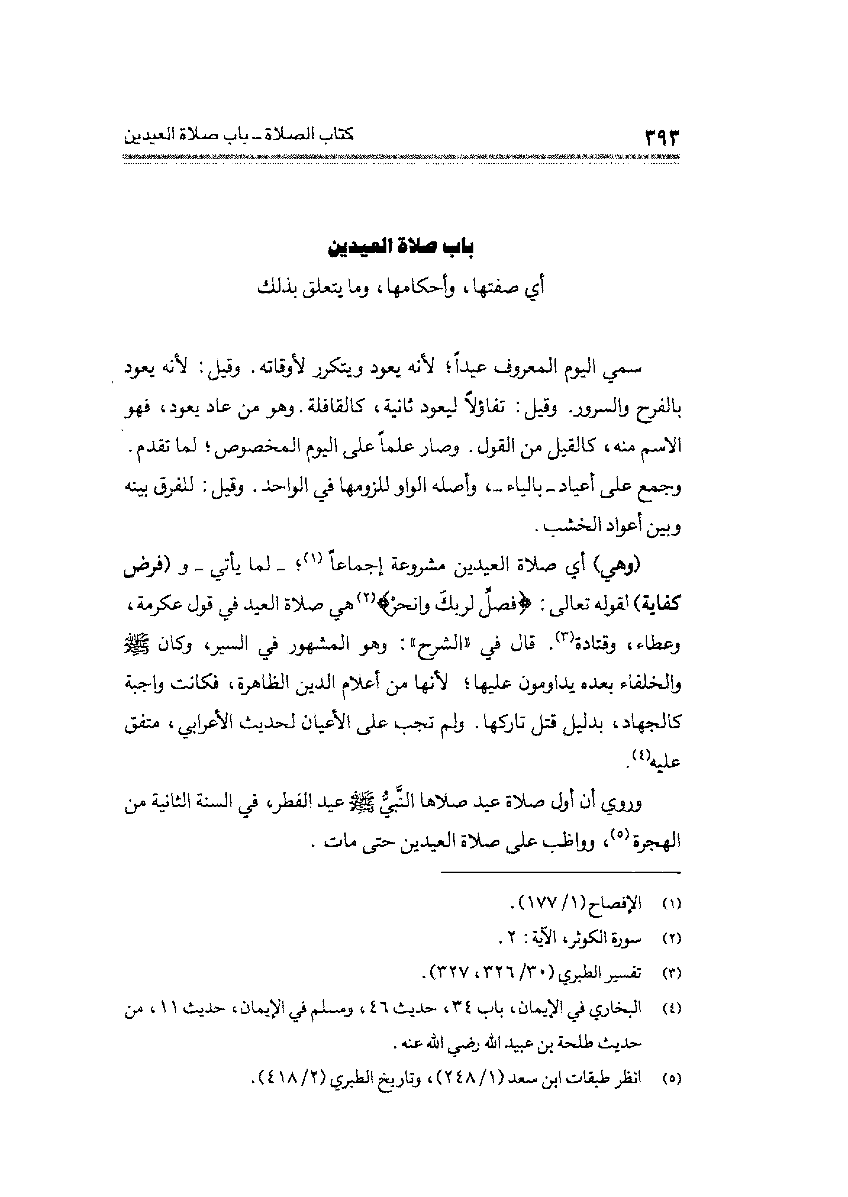 (وهي) أي صلاة العيدين مشروعة إجماعًا (¬١)؛ -لما يأتي- و (فرض كفاية) لقوله تعالى: {فَصَلِّ لِرَبِّكَ وَانْحَرْ} (¬٢) هي صلاة العيد في قول عكرمة، وعطاء، وقتادة (¬٣). قال في "الشرح": وهو المشهور في السير، وكان - صلى الله عليه وسلم - والخلفاء بعده يداومون عليها؛ لأنها من أعلام الدين الظاهرة، فكانت واجبة كالجهاد، بدليل قتل تاركها. ولم تجب على الأعيان لحديث الأعرابي، متفق عليه (¬٤).