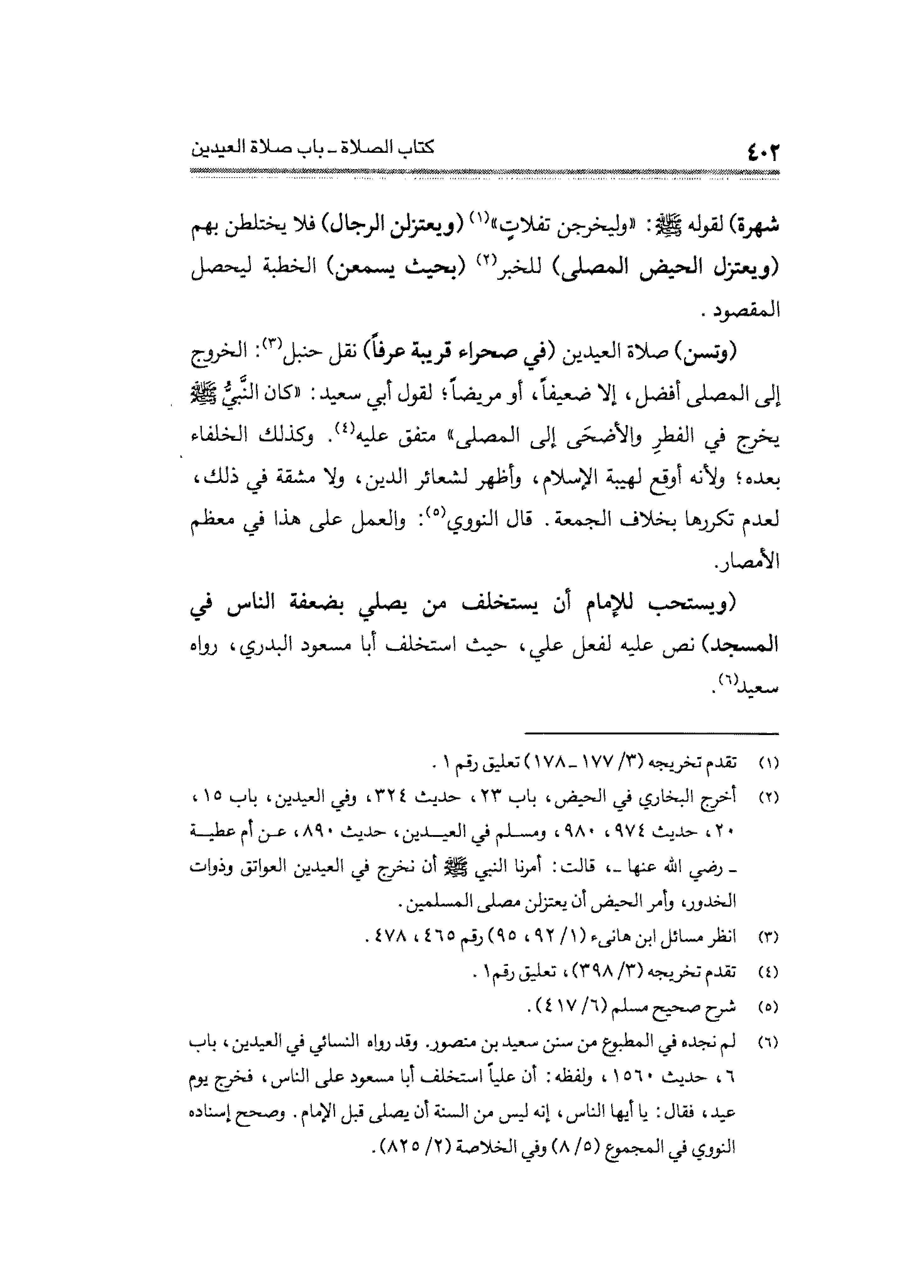 (¬٢) أخرج البخاري في الحيض، باب ٢٣، حديث ٣٢٤، وفي العيدين، باب ١٥، ٢٠، حديث ٩٧٤، ٩٨٠، ومسلم في العيدين، حديث ٨٩٠، عن أم عطية - رضي الله عنها -، قالت: أمرنا النبي - صلى الله عليه وسلم - أن نخرج في العيدين العواتق وذوات الخدور، وأمر الحيض أن يعتزلن مصلى المسلمين.