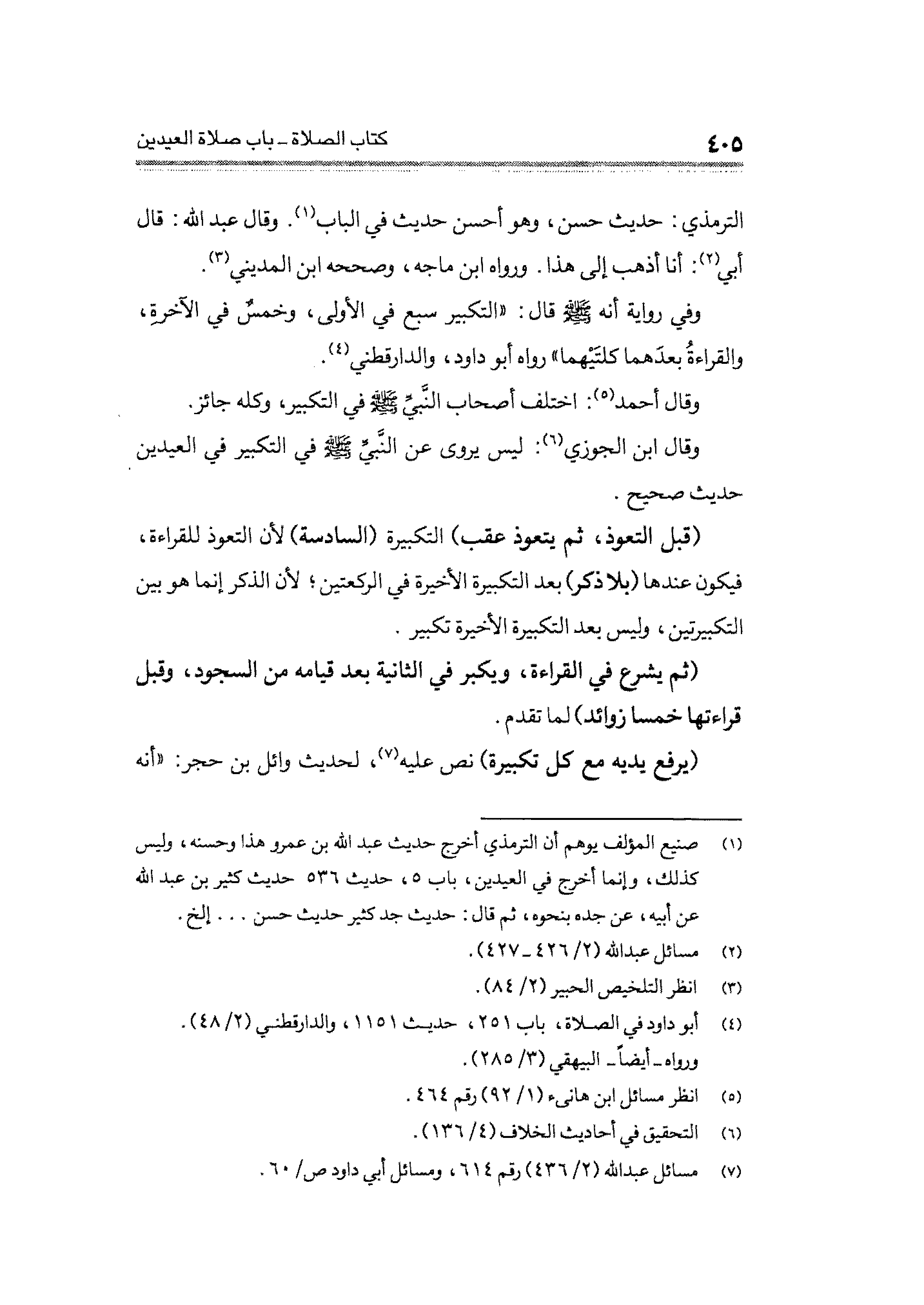 (¬١) صنيع المؤلف يوهم أن الترمذي أخرج حديث عبد الله بن عمرو هذا وحسنه، وليس كذلك، وإنما أخرج في العيدين، باب ٥، حديث ٥٣٦ حديث كثير بن عبد الله عن أبيه، عن جده بنحوه، ثم قال: حديث جد كثير حديث حسن ... إلخ.