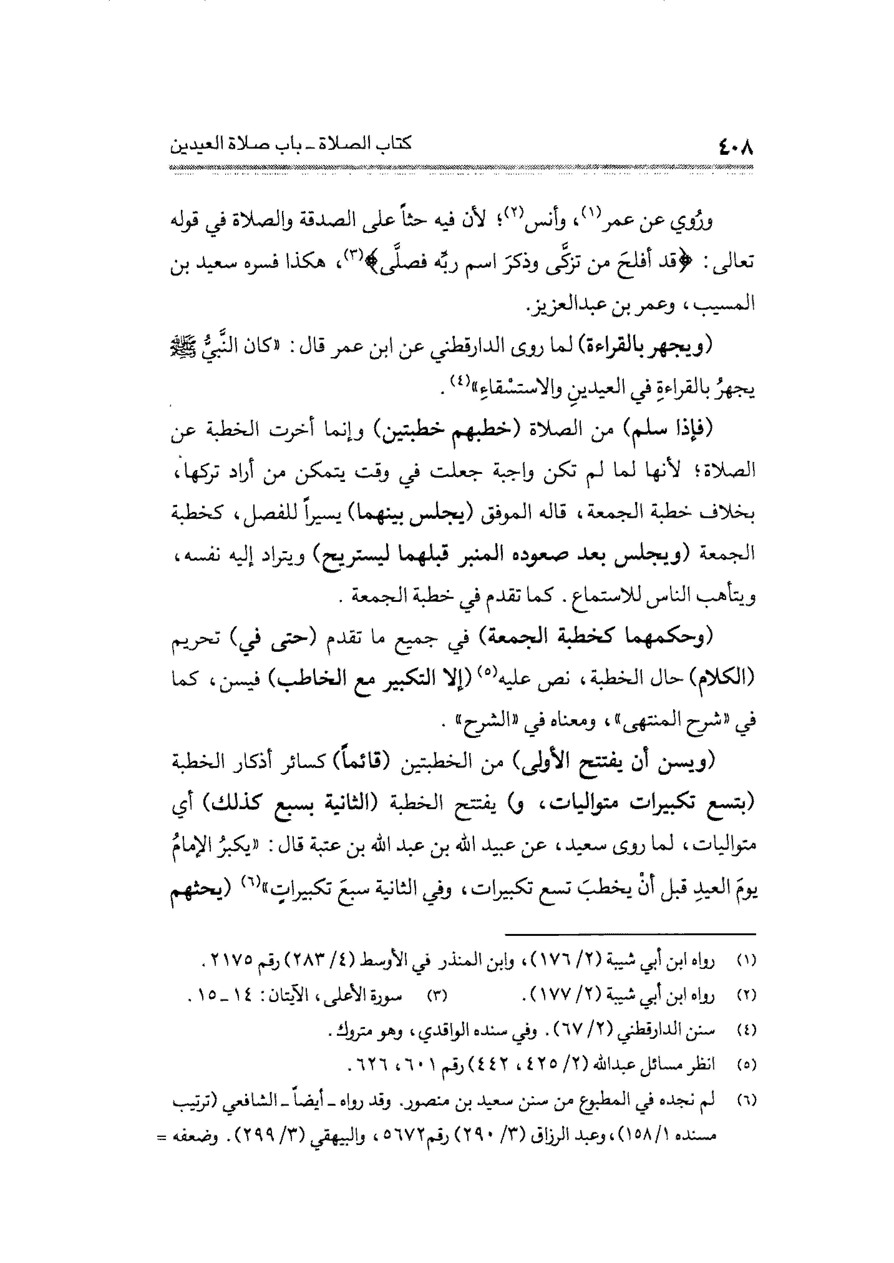 (ويسن أن يفتتح الأولى) من الخطبتين (قائمًا) كسائر أذكار الخطبة (بتسع تكبيرات متواليات، و) يفتتح الخطبة (الثَّانية بسبع كذلك) أي متواليات، لما روى سعيد، عن عبيد الله بن عبد الله بن عتبة قال: "يكبرُ الإمامُ يومَ العيدِ قبل أنْ يخطبَ تسع تكبيرات، وفي الثَّانية سبعَ تكبيراتٍ" (¬٦) (يحثهم