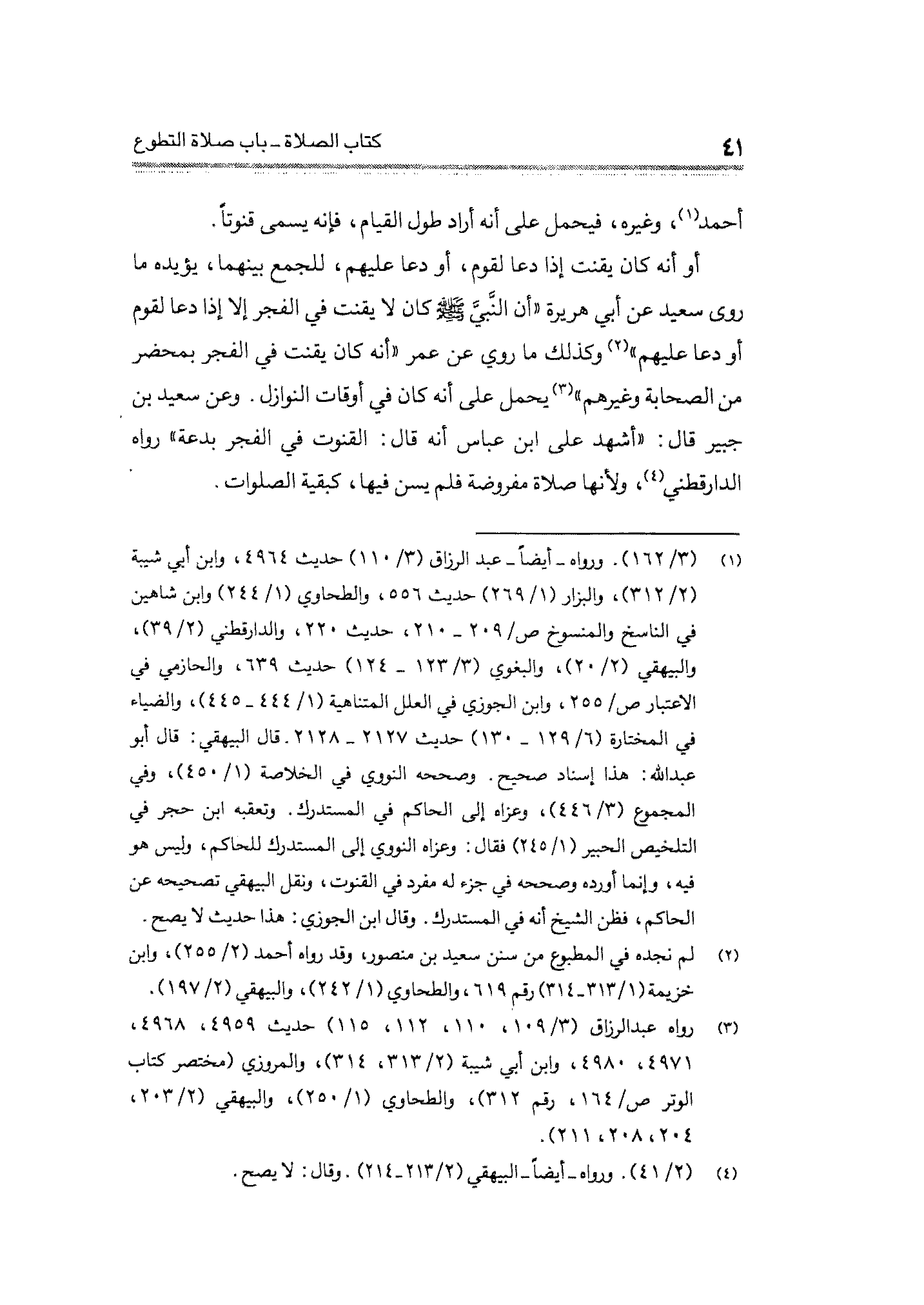 أو أنه كان يقنت إذا دعا لقوم، أو دعا عليهم، للجمع بينهما، يؤيده ما روى سعيد عن أبي هريرة "أن النَّبيَّ - صلى الله عليه وسلم - كان لا يقنت في الفجر إلا إذا دعا لقوم أو دعا عليهم" (¬٢) وكذلك ما روي عن عمر "أنه كان يقنت في الفجر بمحضر من الصحابة وغيرهم" (¬٣) يحمل على أنه كان في أوقات النوازل. وعن سعيد بن جبير قال: "أشهد على ابن عباس أنه قال: القنوت في الفجر بدعة" رواه الدارقطني (¬٤)، ولأنها صلاة مفروضة فلم يسن فيها، كبقية الصلوات.
