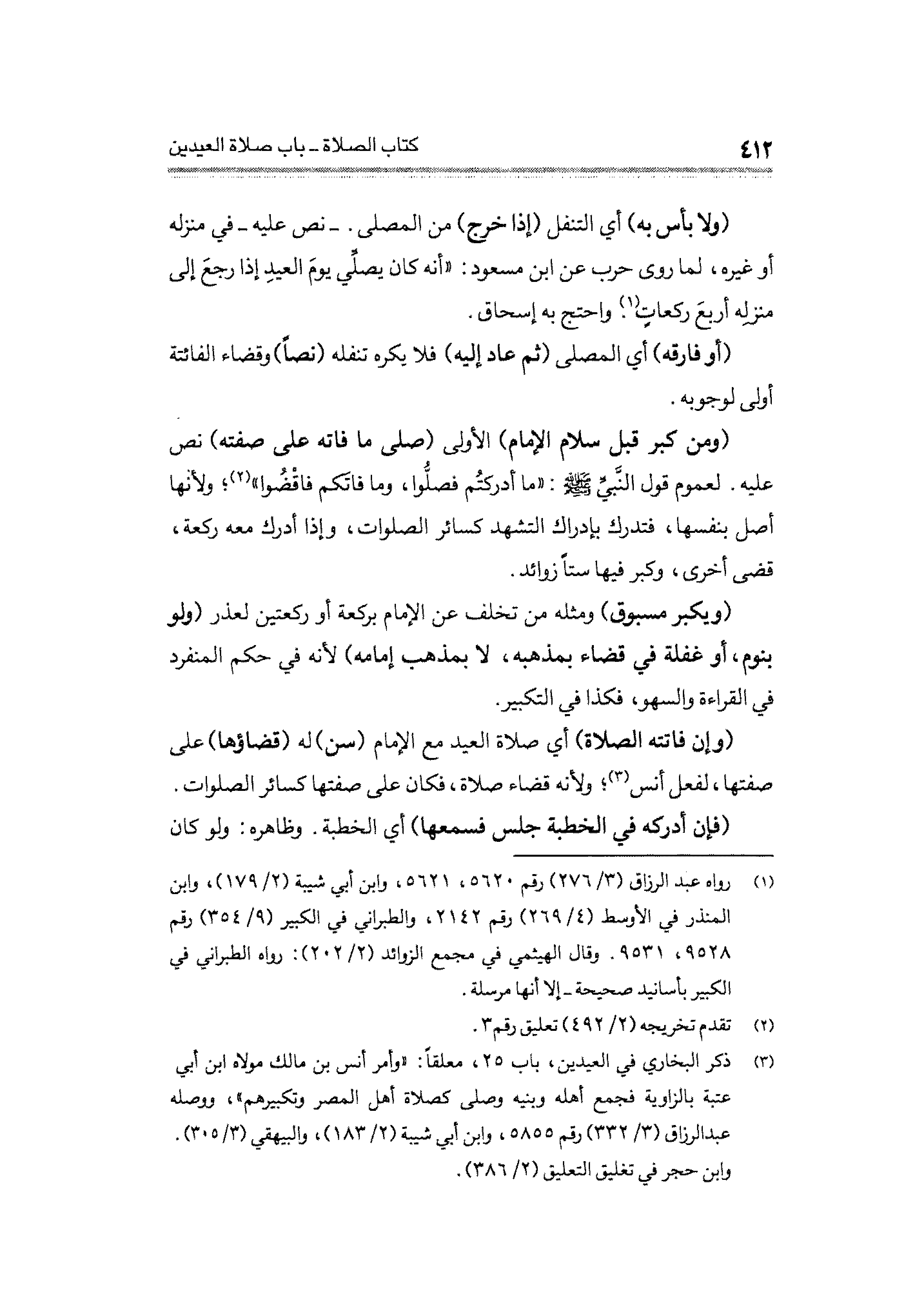 (ولا بأس به) أي التنفل (إذا خرج) من المصلى. -نص عليه- في منزله أو غيره، لما روى حرب عن ابن مسعود: "أنه كان يصلِّي يومَ العيدِ إذا رجعَ إلى منزله أربعَ ركعاتٍ (¬١). واحتج به إسحاق.