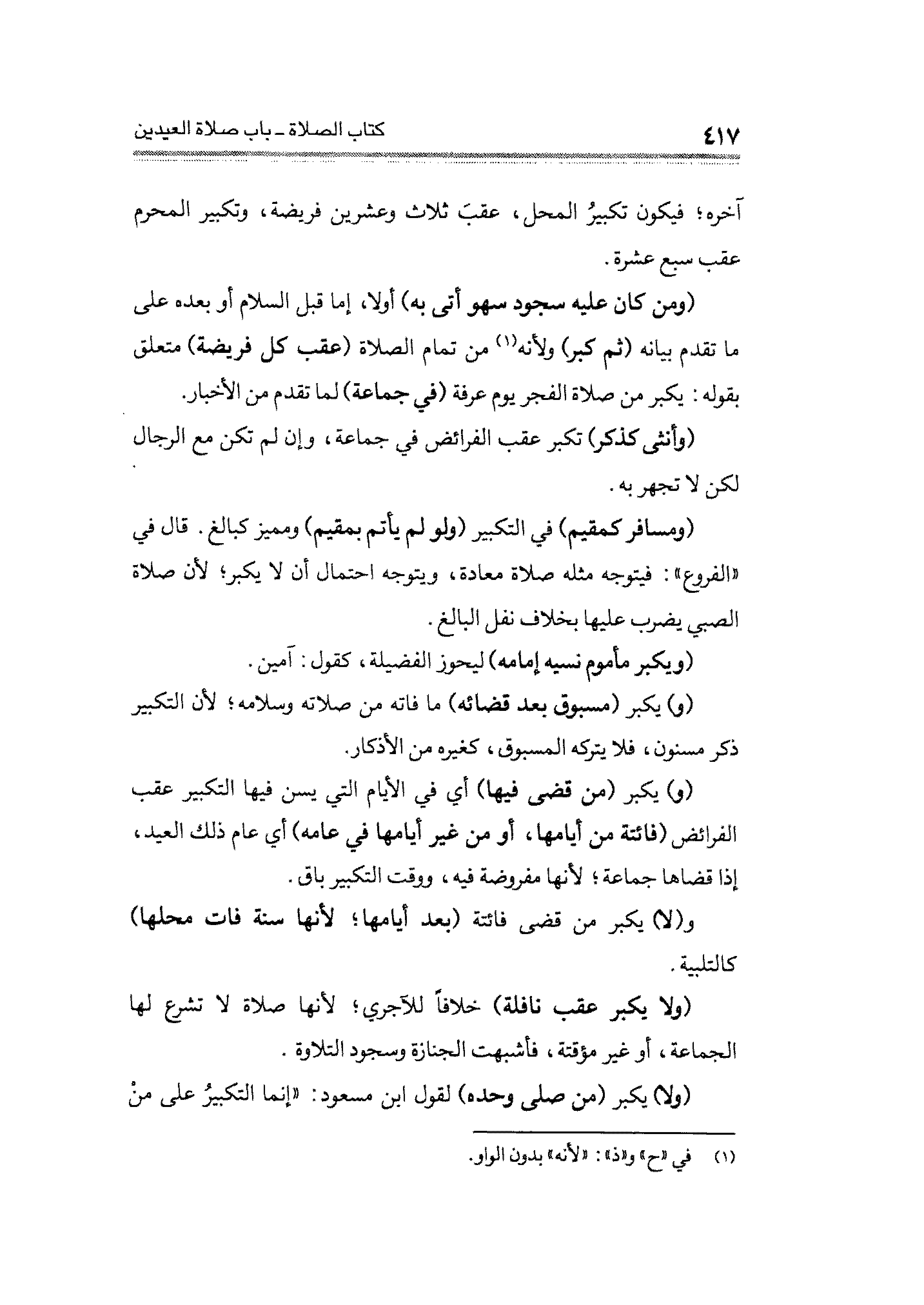 (ومسافر كمقيم) في التكبير (ولو لم يأتم بمقيم) ومميز كبالغ. قال في "الفروع": فيتوجه مثله صلاة معادة، ويتوجه احتمال أن لا يكبر؛ لأن صلاة الصبي يضرب عليها بخلاف نفل البالغ.