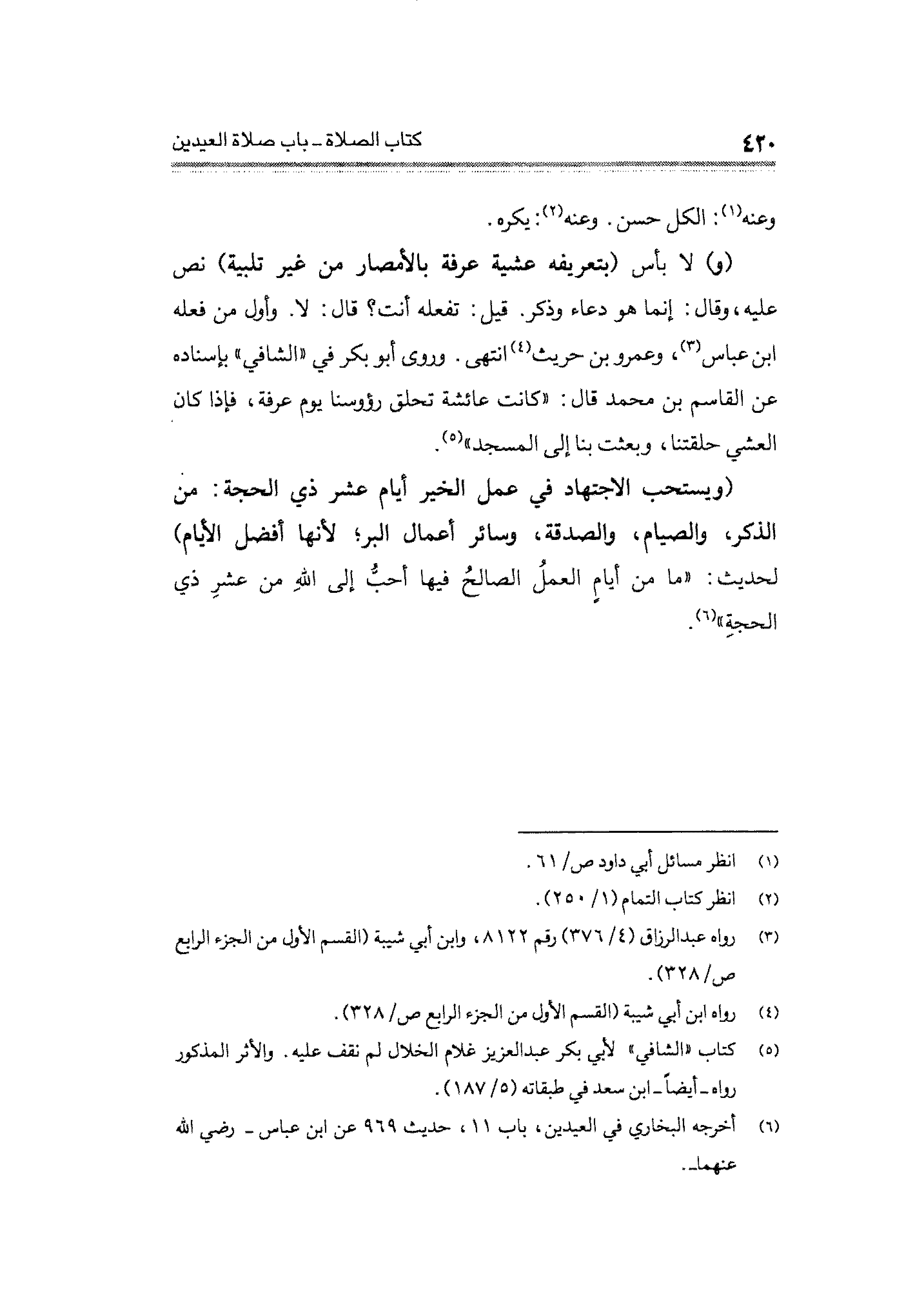 (و) لا بأس (بتعريفه عشية عرفة بالأمصار من غير تلبية) نص عليه، وقال: إنما هو دعاء وذكر. قيل: تفعله أنت؟ قال: لا. وأول من فعله ابن عباس (¬٣)، وعمرو بن حريث (¬٤) انتهى. وروى أبو بكر في "الشافي "بإسناده عن القاسم بن محمد قال: "كانت عائشة تحلق رؤوسنا يوم عرفة، فإذا كان العشي حلقتنا، وبعثت بنا إلى المسجد" (¬٥).