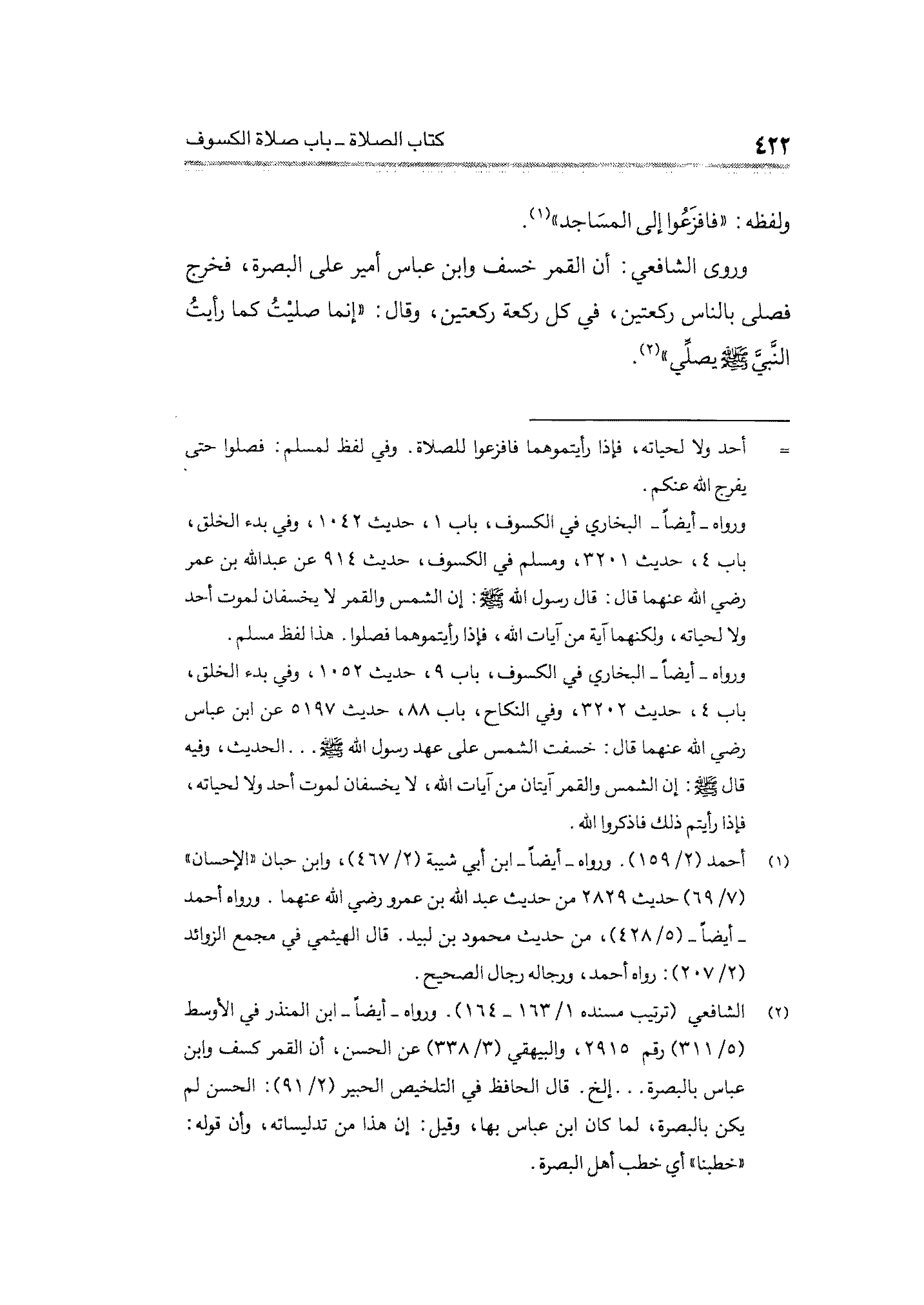 (¬٢) الشافعي (ترتيب مسنده ١/ ١٦٣ - ١٦٤). ورواه -أيضًا- ابن المنذر في الأوسط (٥/ ٣١١) رقم ٢٩١٥، والبيهقي (٣/ ٣٣٨) عن الحسن، أن القمر كسف وابن عباس بالبصرة ... إلخ. قال الحافظ في التلخيص الحبير (٢/ ٩١): الحسن لم يكن بالبصرة، لما كان ابن عباس بها، وقيل: إن هذا من تدليساته، وأن قوله: "خطبنا" أي خطب أهل البصرة.
