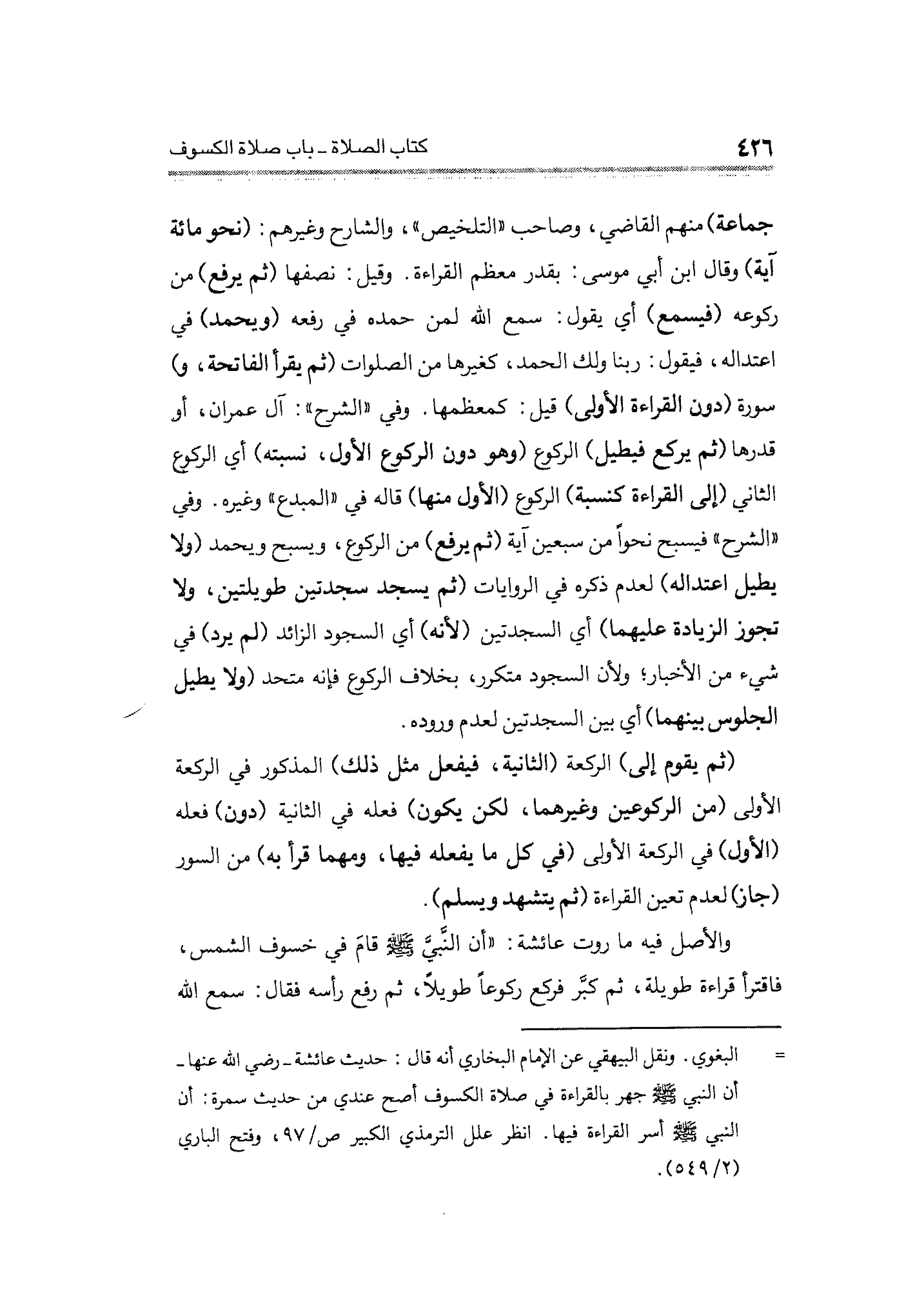 = البغوي. ونقل البيهقي عن الإِمام البخاري أنه قال: حديث عائشة - رضي الله عنها - أن النبي - صلى الله عليه وسلم - جهر بالقراءة في صلاة الكسوف أصح عندي من حديث سمرة: أن النبي - صلى الله عليه وسلم - أسر القراءة فيها. انظر علل الترمذي الكبير ص / ٩٧، وفتح الباري (٢/ ٥٤٩).