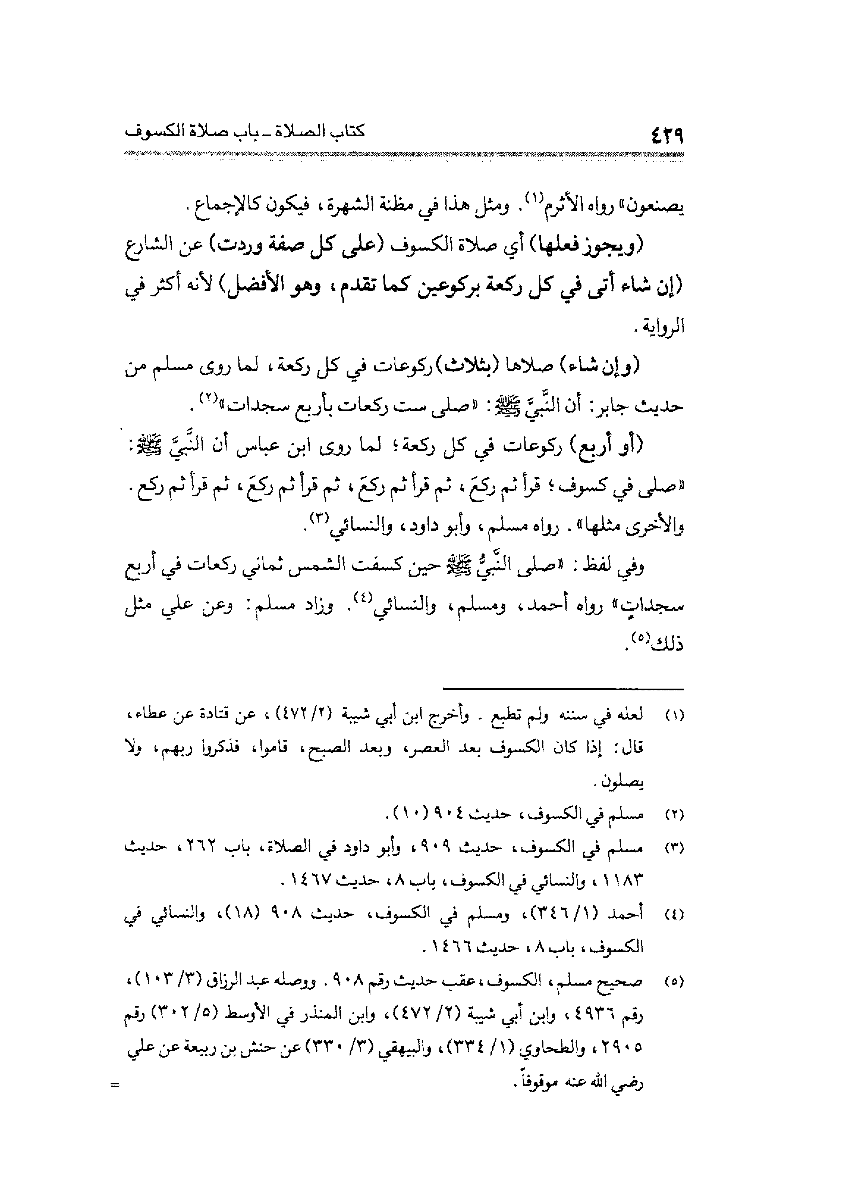 (¬٥) صحيح مسلم، الكسوف، عقب حديث رقم ٩٠٨. ووصله عبد الرزاق (٣/ ١٠٣)، رقم ٤٩٣٦، وابن أبي شيبة (٢/ ٤٧٢)، وابن المنذر في الأوسط (٥/ ٣٠٢) رقم ٢٩٠٥، والطحاوي (١/ ٣٣٤)، والبيهقي (٣/ ٣٣٠) عن حنش بن ربيعة عن علي رضي الله عنه موقوفًا. =