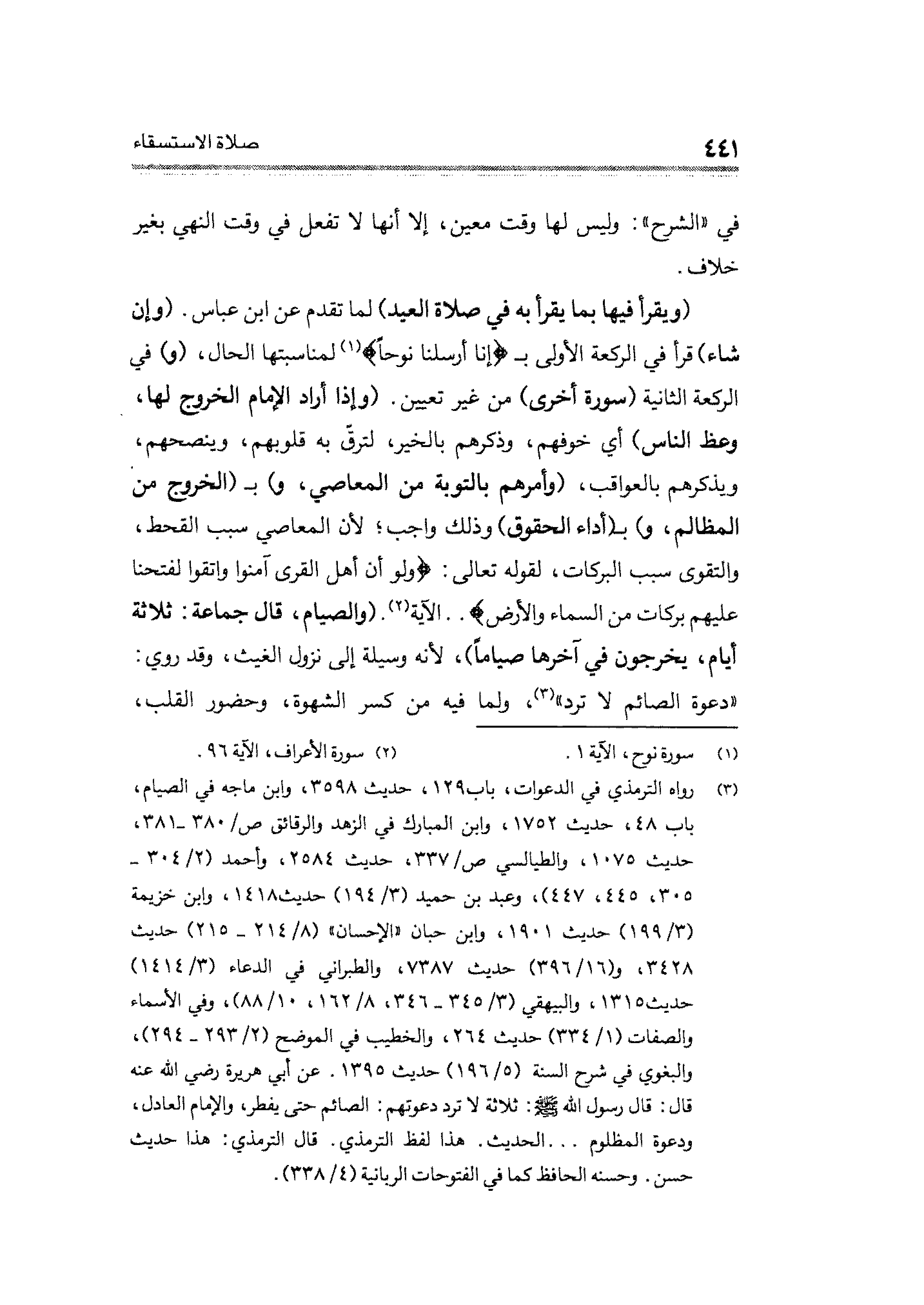 (ويقرأ فيها بما يقرأ به في صلاة العيد) لما تقدم عن ابن عباس. (وإن شاء) قرأ في الركعة الأولى بـ {إنا أرسلنا نوحًا} (¬١) لمناسبتها الحال، (و) في الركعة الثانية (سورة أخرى) من غير تعيين. (وإذا أراد الإمام الخروج لها، وعظ الناس) أي خوفهم، وذكرهم بالخير، لترقّ به قلوبهم، وينصحهم، ويذكرهم بالعواقب، (وأمرهم بالتوبة من المعاصي، و) بـ (الخروج من المظالم، و) بـ (أداء الحقوق) وذلك واجب؛ لأن المعاصي سبب القحط، والتقوى سبب البركات، لقوله تعالى: {ولو أن أهل القرى آمنوا واتقوا لفتحنا عليهم بركات من السماء والأرض} .. الآية (¬٢). (والصيام، قال جماعة: ثلاثة أيام، يخرجون في آخرها صيامًا)، لأنه وسيلة الى نرول الغيث، وقد روي: "دعوة الصائم لا ترد" (¬٣)، ولما فيه من كسر الشهوة، وحضور القلب،