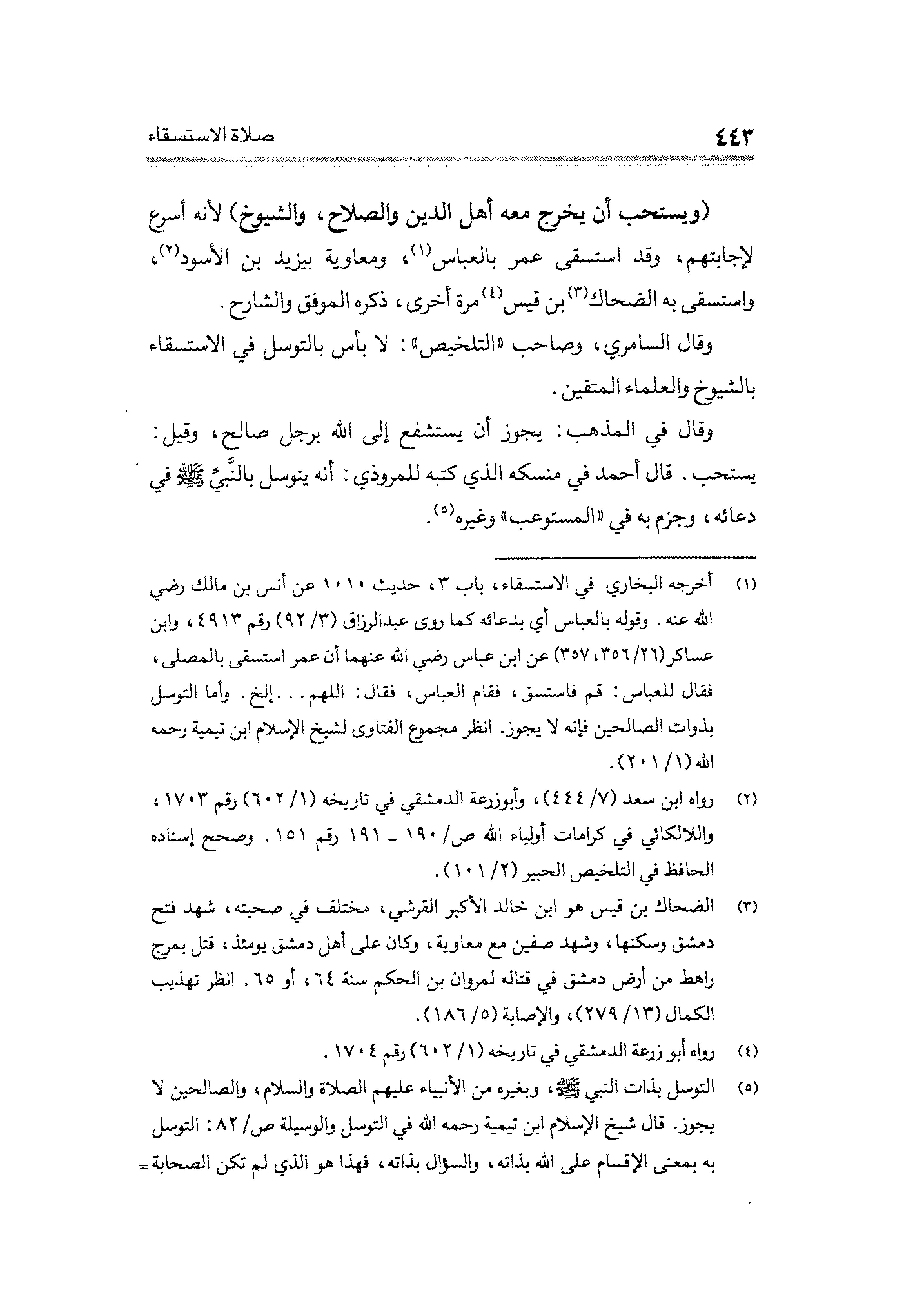 (¬١) أخرجه البخاري في الاستسقاء، باب ٣، حديث ١٠١٠ عن أنس بن مالك رضي الله عنه. وقوله بالعباس أي بدعائه كما روى عبد الرزاق (٣/ ٩٢) رقم ٤٩١٣، وابن عساكر (٢٦/ ٣٥٦، ٣٥٧) عن ابن عباس رضي الله عنهما أن عمر استسقى بالمصلى، فقال للعباس: قم فاستسق، فقام العباس، فقال: اللهم ... إلخ. وأما التوسل بذوات الصالحين فإنه لا يجوز. انظر مجموع الفتاوى لشيخ الإسلام ابن تيمية رحمه الله (١/ ٢٠١).