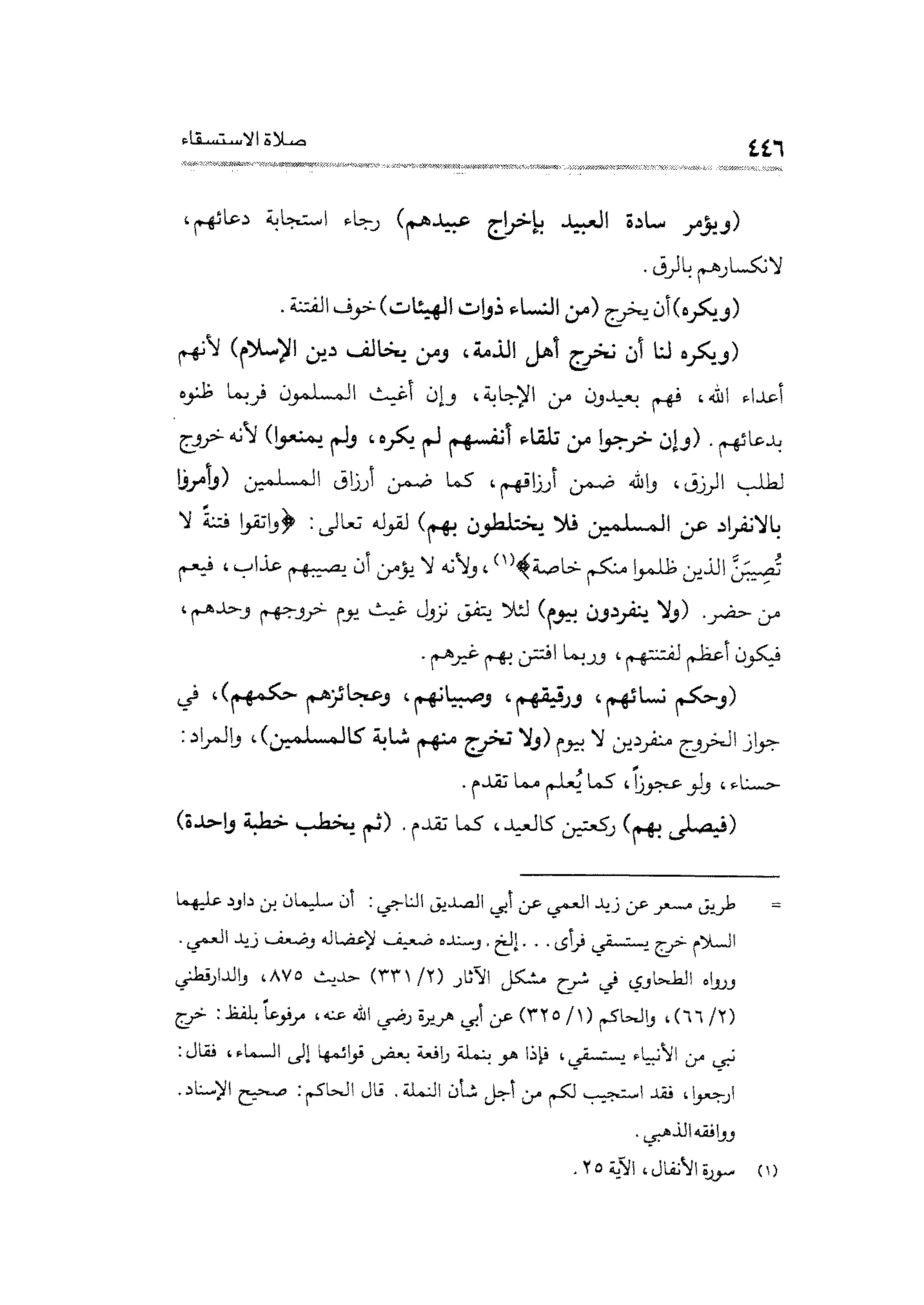 (ويكره لنا أن نخرج أهل الذمة، ومن يخالف دين الإسلام) لأنهم أعداء الله، فهم بعيدون من الإجابة، وإن أغيث المسلمون فربما ظنوه بدعائهم. (وإن خرجوا من تلقاء أنفسهم لم يكره، ولم يمنعوا) لأنه خروج لطلب الرزق، والله ضمن أرزاقهم، كما ضمن أرزاق المسلمين (وأمروا بالانفراد عن المسلمين فلا يختلطون بهم) لقوله تعالى: {واتقوا فتنةً لا تُصِيبَنَّ الذين ظلموا منكم خاصة} (¬١)، ولأنه لا يؤمن أن يصيبهم عذاب، فيعم من حضر. (ولا ينفردون بيوم) لئلا يتفق نزول غيث يوم خروجهم وحدهم، فيكون أعظم لفتنتهم، وربما افتتن بهم غيرهم.
