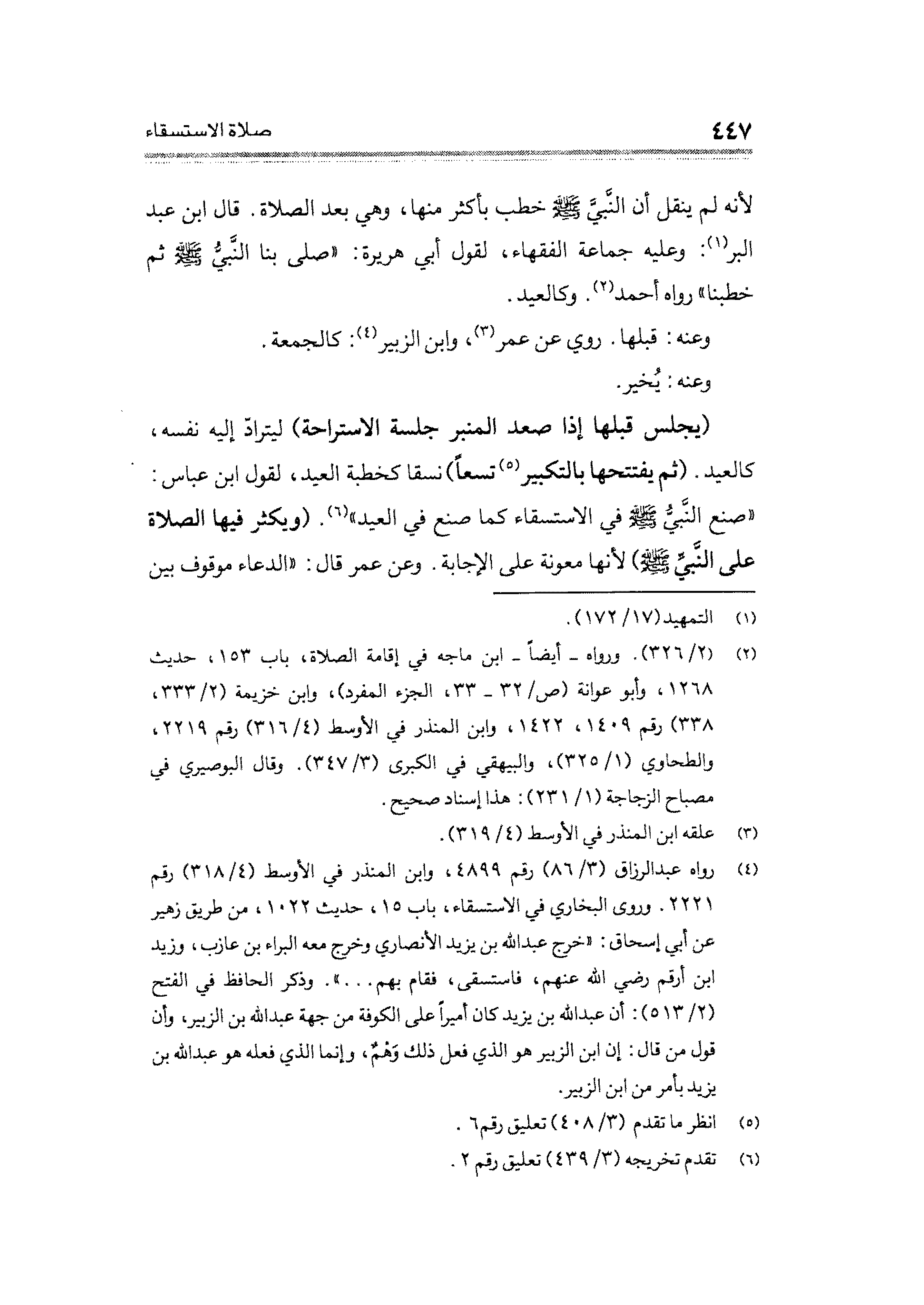 (¬٤) رواه عبد الرزاق (٣/ ٨٦) رقم ٤٨٩٩، وابن المنذر في الأوسط (٤/ ٣١٨) رقم ٢٢٢١. وروى البخاري في الاستسقاء، باب ١٥، حديث ١٠٢٢، من طريق زهير عن أبي إسحاق: "خرج عبد الله بن يزيد الأنصاري وخرج معه البراء بن عازب، وزيد ابن أرقم رضي الله عنهم، فاستقى، فقام بهم ... ". وذكر الحافظ في الفتح (٢/ ٥١٣): أن عبد الله بن يزيد كان أميرًا على الكوفة من جهة عبد الله بن الزبير، وأن قول من قال: أن ابن الزبير هو الذي فعل ذلك وَهْمٌ، وإنما الذي فعله هو عبد الله بن يزيد بأمر من ابن الزبير.