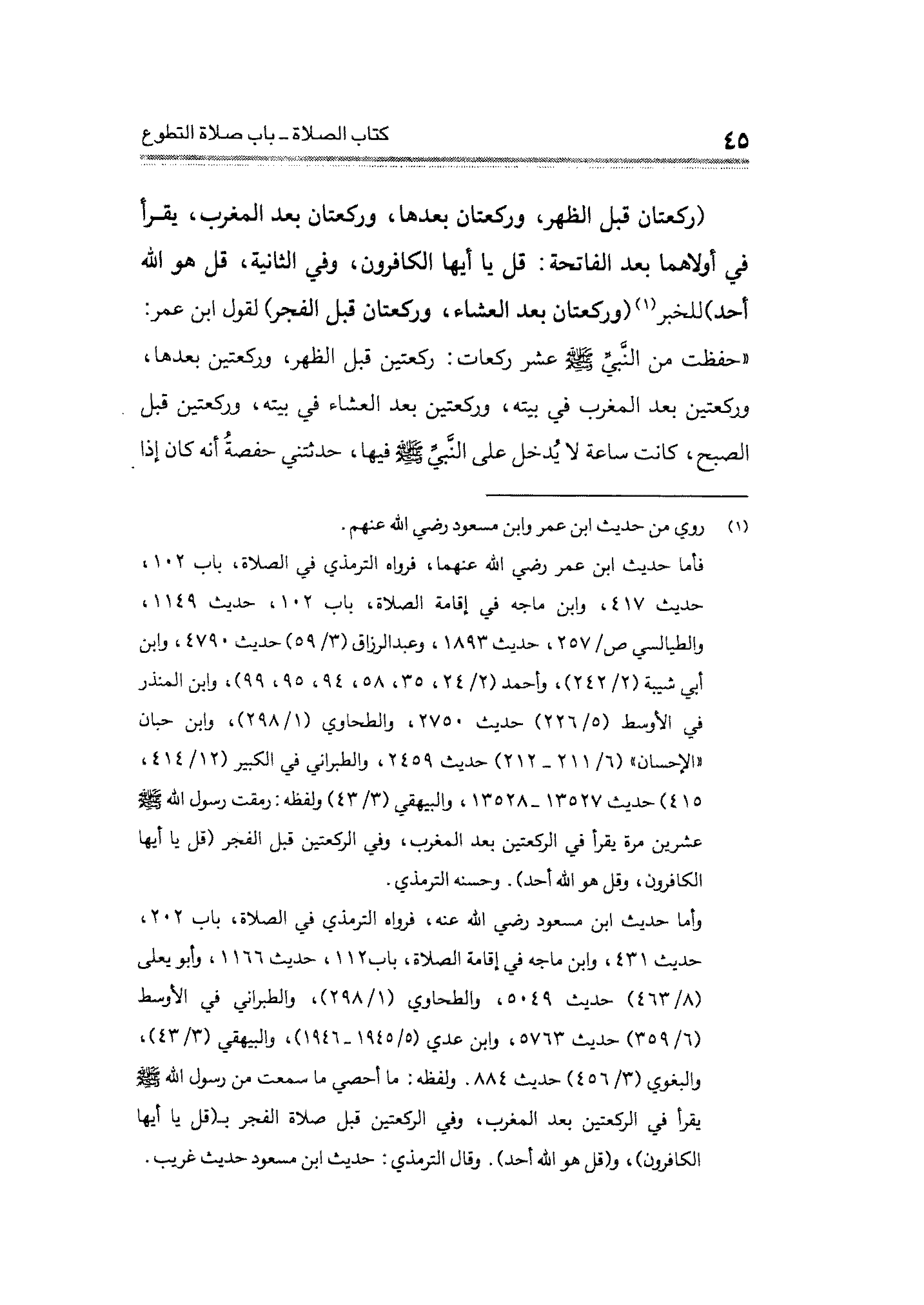 وأما حديث ابن مسعود رضي الله عنه، فرواه الترمذي في الصلاة، باب ٢٠٢، حديث ٤٣١، وابن ماجه في إقامة الصلاة، باب ١١٢، حديث ١١٦٦، وأبو يعلى (٨/ ٤٦٣) حديث ٥٠٤٩، والطحاوي (١/ ٢٩٨)، والطبراني في الأوسط (٦/ ٣٥٩) حديث ٥٧٦٣، وابن عدى (٥/ ١٩٤٥ - ١٩٤٦)، والبيهقي (٣/ ٤٣)، والبغوي (٣/ ٤٥٦) حديث ٨٨٤. ولفظه: ما أحصي ما سمعت من رسول الله - صلى الله عليه وسلم - يقرأ في الركعتين بعد المغرب، وفي الركعتين قبل صلاة الفجر بـ (قل يا أيها الكافرون)، و (قل هو الله أحد). وقال الترمذي: حديث ابن مسعود حديث غريب.