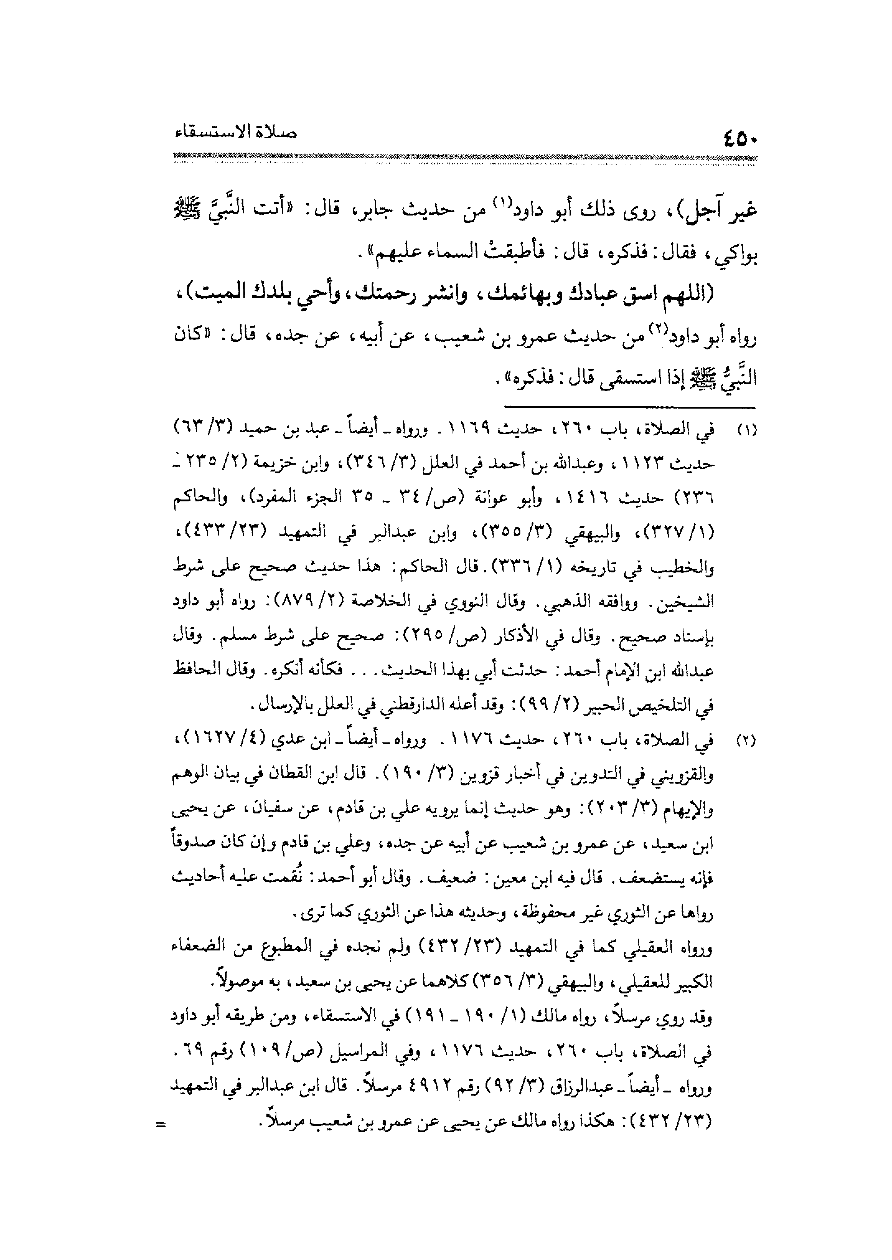 وقد روي مرسلًا، رواه مالك (١/ ١٩٠ - ١٩١) في الاستسقاء، ومن طريقه أبو داود في الصلاة، باب ٢٦٠، حديث ١١٧٦، وفي المراسيل (ص / ١٠٩) رقم ٦٩.