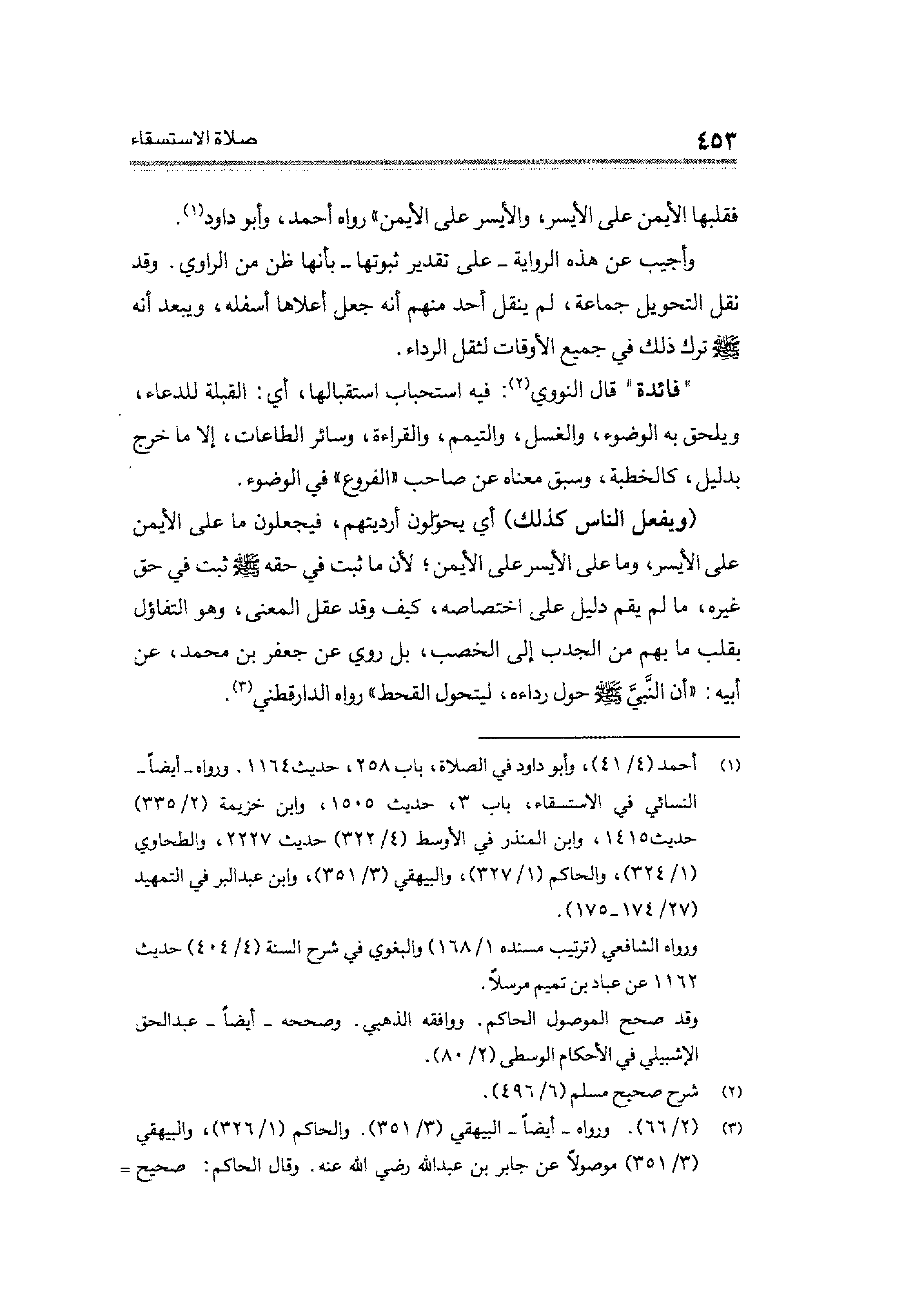 وأجيب عن هذه الرواية -على تقدير ثبوتها - بأنها ظن من الراوي. وقد نقل التحويل جماعة، لم ينقل أحد منهم أنَّه جعل أعلاها أسفله، ويبعد أنَّه - صلى الله عليه وسلم - ترك ذلك في جميع الأوقات لثقل الرداء.