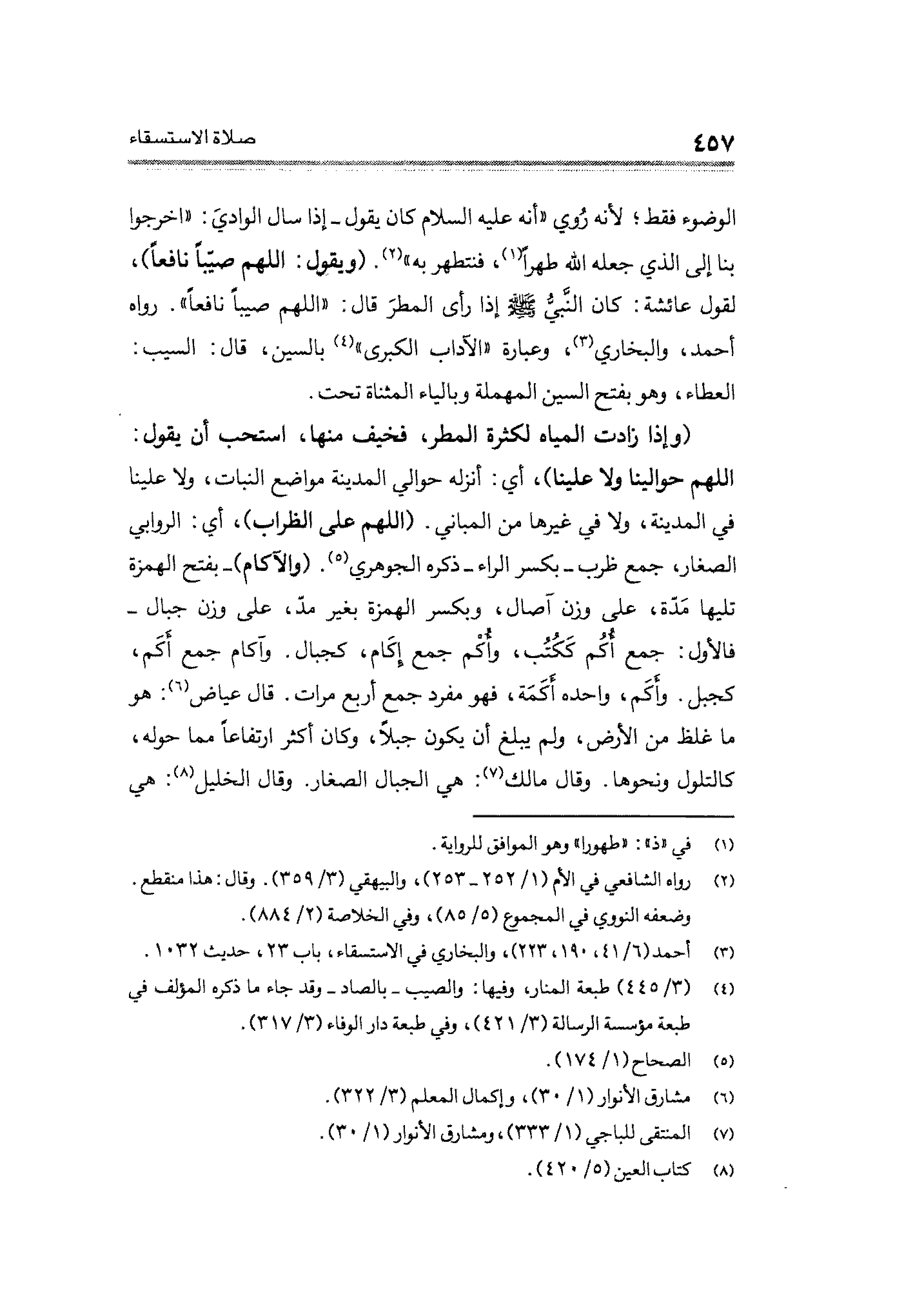 (وإذا زادت المياه لكثرة المطر، فخيف منها، استحب أن يقول: اللهمَّ حوالينا ولا علينا)، أي: أنزله حوالي المدينة مواضع النبات، ولا علينا في المدينة، ولا في غيرها من المباني. (اللهمَّ على الظراب)، أي: الروابي الصغار، جمع ظرب -بكسر الراء- ذكره الجوهري (¬٥). (والآكام) -بفتح الهمزة تليها مَدّة، على وزن آصال، وبكسر الهمزة بغير مدّ، على وزن جبال- فالأول: جمع أُكُم كَكُتُب، وأُكْم جمع إكَام، كجبال. وآكام جمع أَكَم، كجبل. وأكَم، واحده أَكَمَة، فهو مفرد جمع أربع مرات. قال عياض (¬٦): هو ما غلظ من الأرض، ولم يبلغ أن يكون جبلًا، وكان أكثر ارتفاعًا مما حوله، كالتلول ونحوها. وقال مالك (¬٧): هي الجبال الصغار. وقال الخليل (¬٨): هي