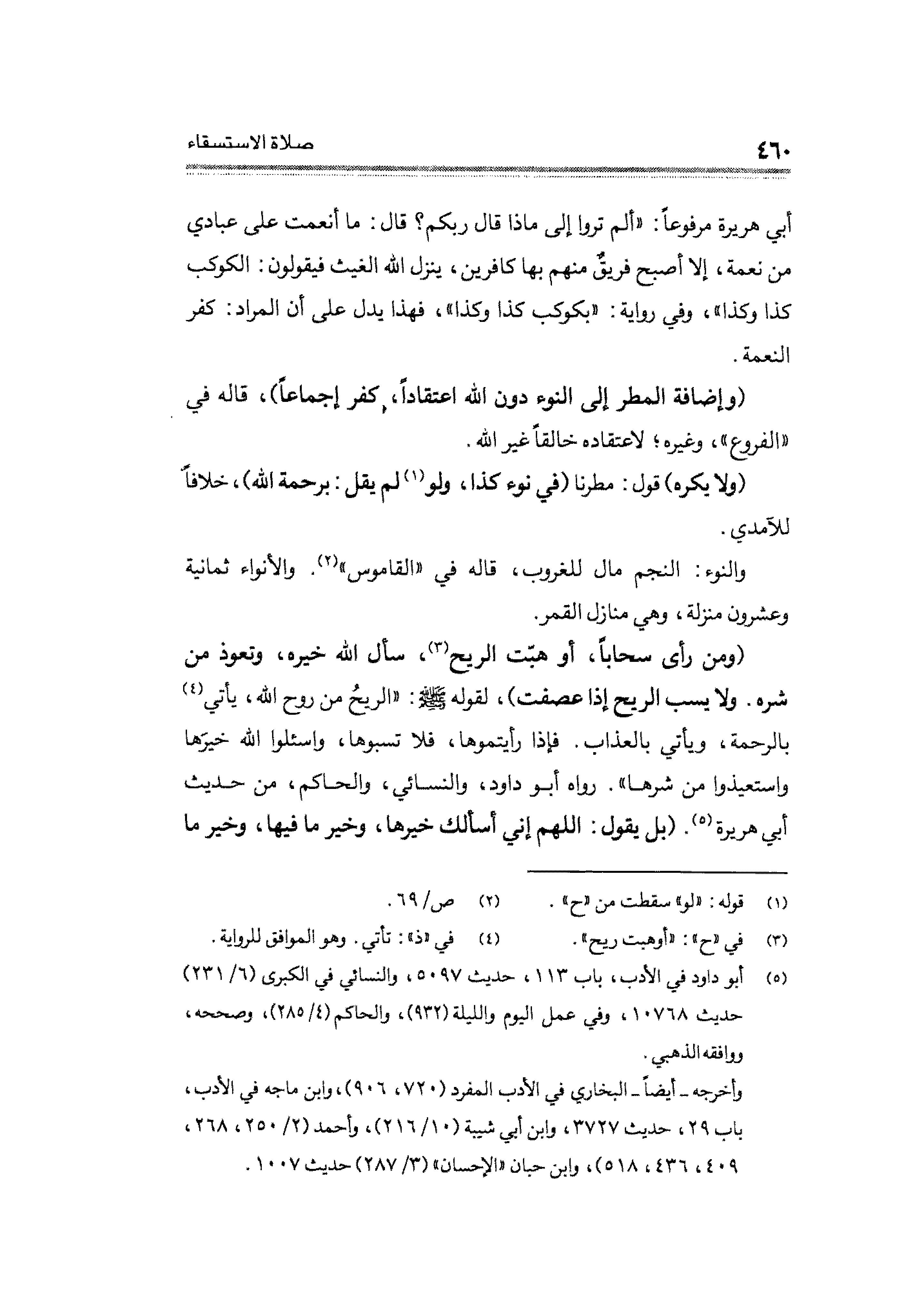 أبي هريرة مرفوعًا: "ألم تروا إلى ماذا قال ربكم؟ قال: ما أنعمت على عبادي من نعمة، إلَّا أصبح فريقٌ منهم بها كافرين، ينزل الله الغيث فيقولون: الكوكب كذا وكذا" وفي رواية: "بكوكب كذا وكذا"، فهذا يدل على أن المراد: كفر النعمة.