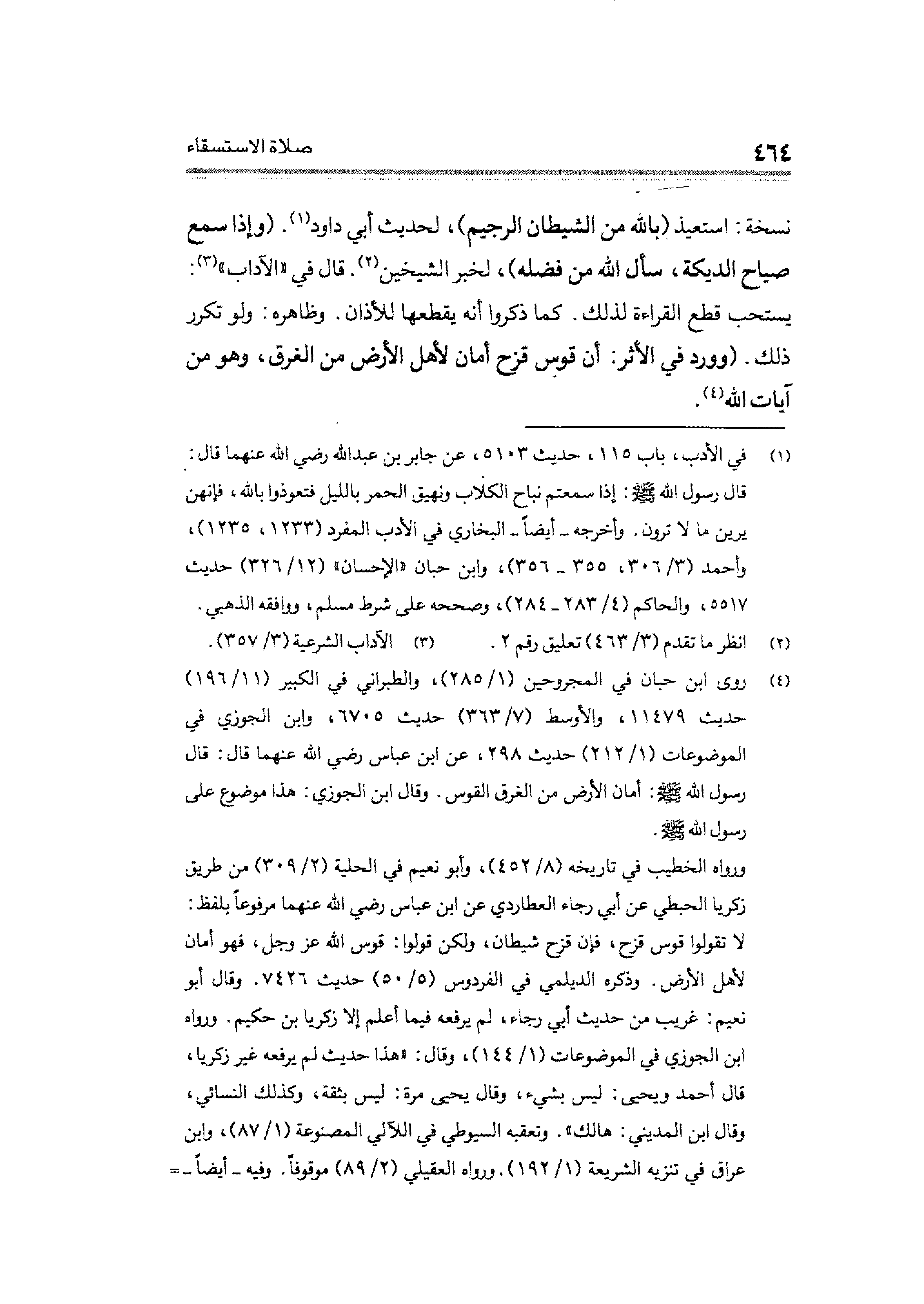 (¬١) في الأدب، باب ١١٥، حديث ٥١٠٣، عن جابر بن عبد الله - رضي الله عنه - عنهما قال: قال رسول الله - صلى الله عليه وسلم -: إذا سمعتم نباح الكلاب ونهيق الحمر بالليل فتعوذوا بالله، فإنهن يرين ما لا ترون. وأخرجه -أيضًا- البخاري في الأدب المفرد (١٢٣٣، ١٢٣٥)، وأحمد (٣/ ٣٠٦، ٣٥٥ - ٣٥٦)، وابن حبان "الإحسان" (١٢/ ٣٢٦) حديث ٥٥١٧، والحاكم (٤/ ٢٨٣ - ٣٨٤)، وصححه على شرط مسلم، ووافقه الذهبي.