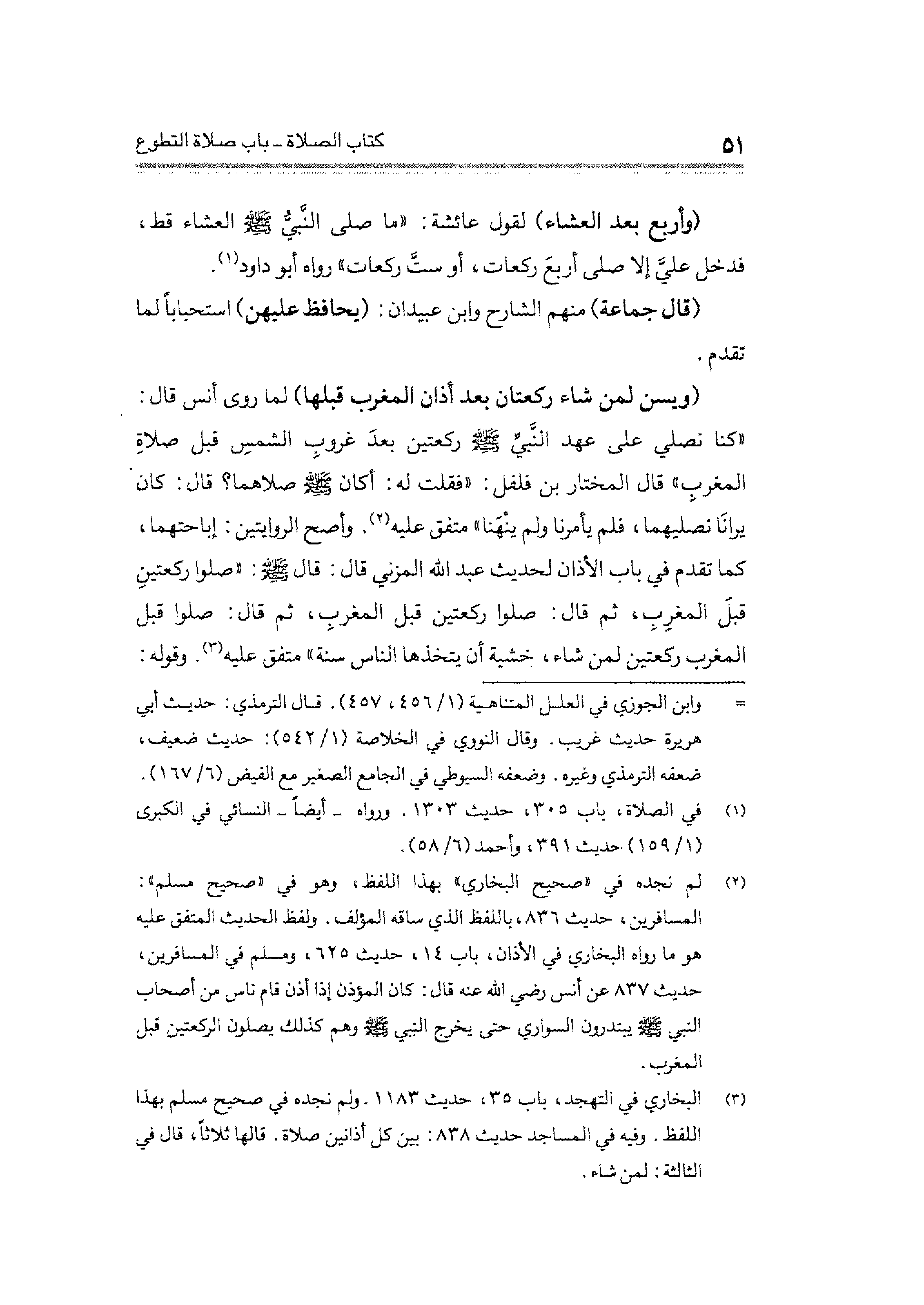 (¬٣) البُخاريّ في التهجد، باب ٣٥، حديث ١١٨٣. ولم نجده في صحيح مسلم بهذا اللفظ. وفيه في المساجد حديث ٨٣٨: بين كل أذانين صلاة. قالها ثلاثًا، قال في الثالثة: لمن شاء.