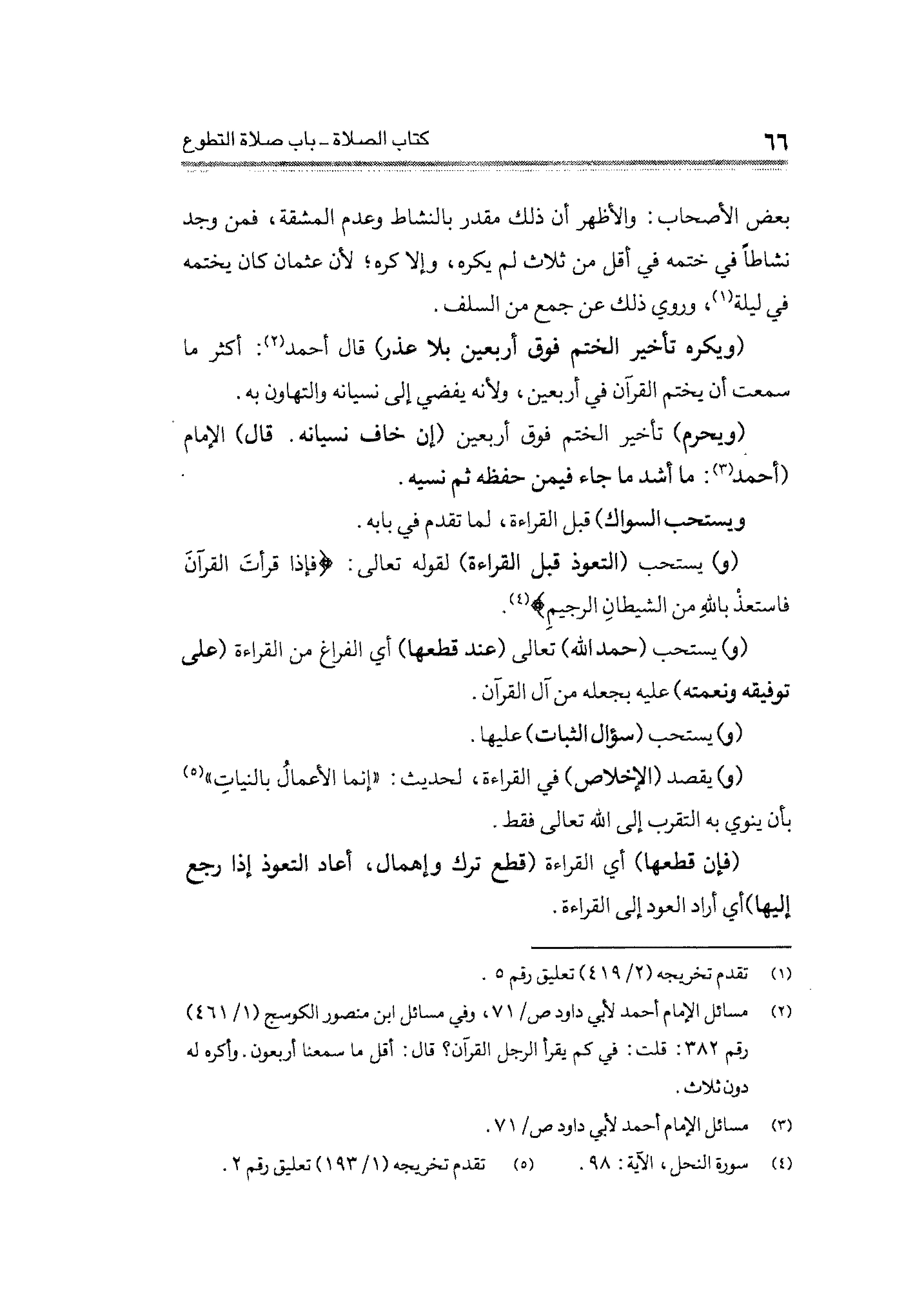 (ويحرم) تأخير الختم فوق أربعين (إن خاف نسيانه. قال) الإمام (أحمد (¬٣): ما أشد ما جاء فيمن حفظه ثم نسيه.