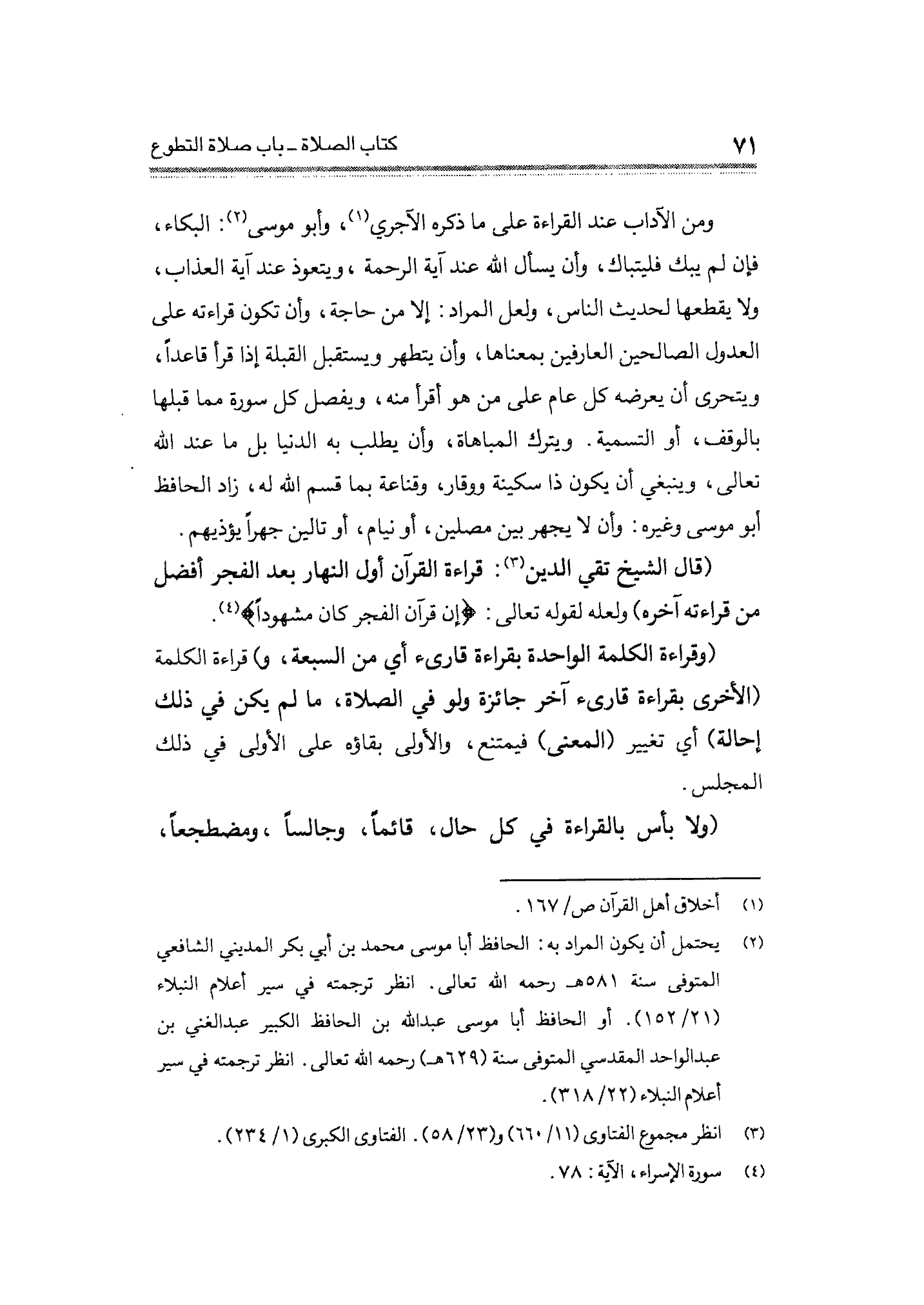 (قال الشيخ تقي الدين (¬٣): قراءة القرآن أول النهار بعد الفجر أفضل من قراءته آخره) ولعله لقوله تعالى: {إِنَّ قُرْآنَ الْفَجْرِ كَانَ مَشْهُودًا} (¬٤).
