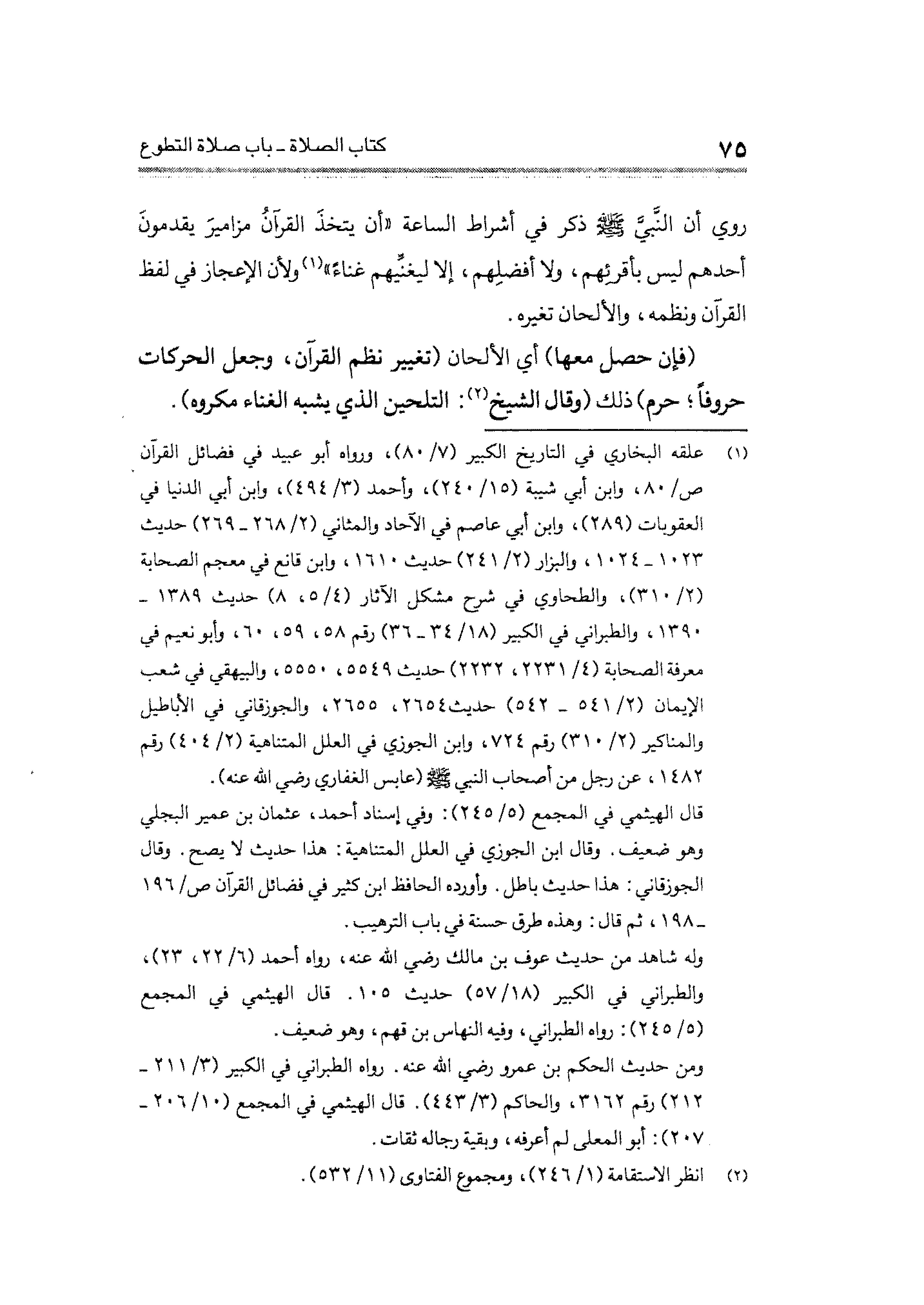 روي أن النَّبيَّ - صلى الله عليه وسلم - ذكر في أشراط الساعة "أن يتخذَ القرآن مزاميرَ يقدمونَ أحدهم ليس بأقرئِهم، ولا أفضلِهم، إلا ليغنِّيهم غناءً" (¬١) ولأن الإعجاز في لفظ القرآن ونظمه، والألحان تغيره.