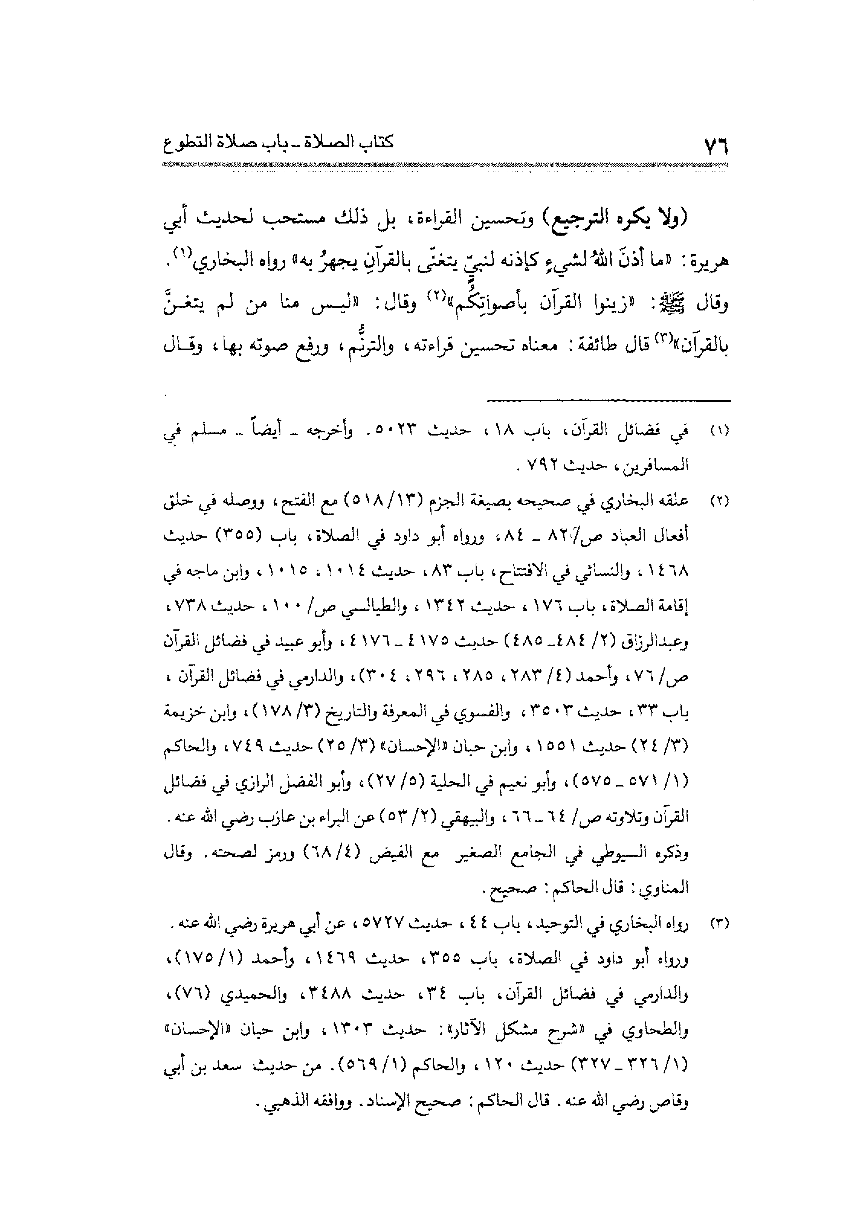 (ولا يكره الترجيع) وتحسين القراءة، بل ذلك مستحب لحديث أبي هريرة: "ما أذنَ اللهُ لشيءٍ كإذنه لنبيٍّ يتغنّى بالقرآنِ يجهرُ به" رواه البخاري (¬١). وقال - صلى الله عليه وسلم -: "زينوا القرآن بأصواتِكُم" (¬٢) وقال: "ليس منا من لم يتغنَّ بالقرآن" (¬٣) قال طائفة: معناه تحسين قراءته، والترنُّم، ورفع صوته بها، وقال