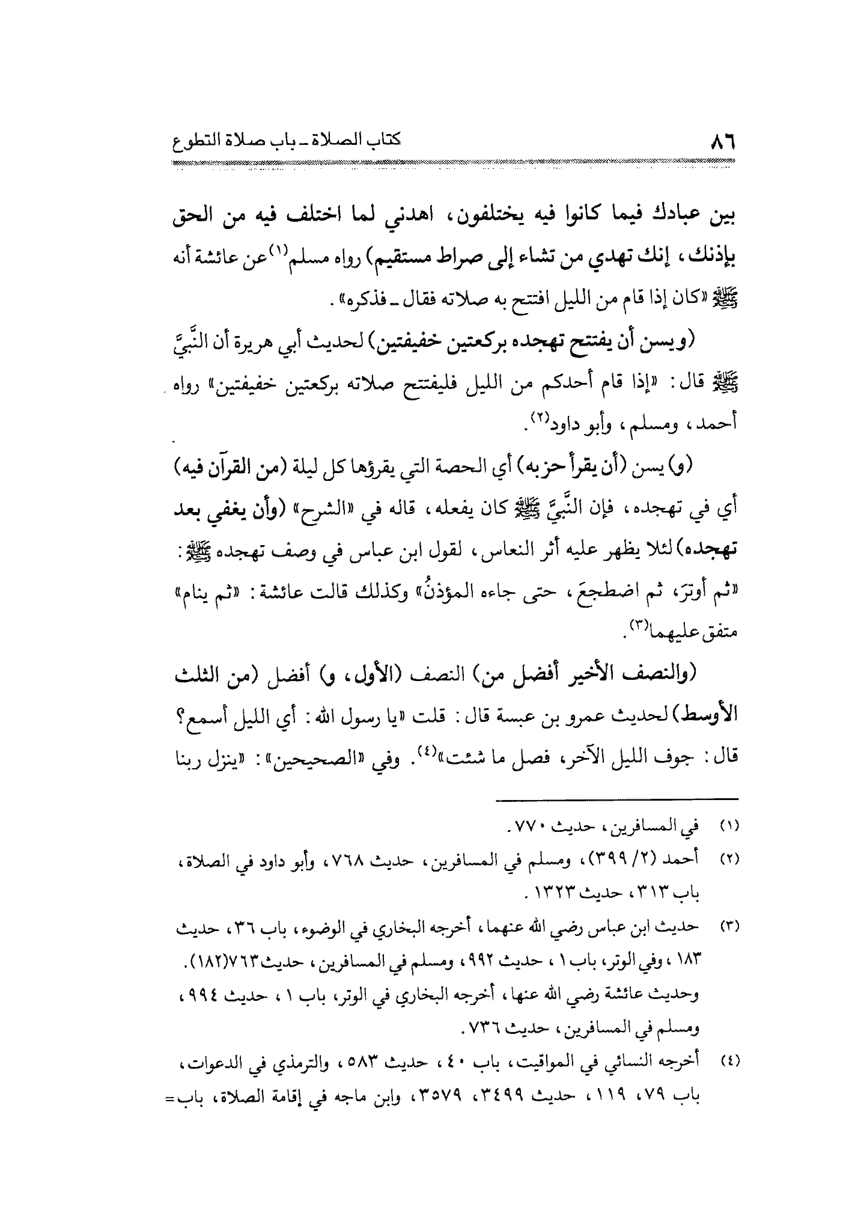 (¬٣) حديث ابن عباس رضي الله عنهما، أخرجه البخاري في الوضوء باب ٣٦، حديث ١٨٣، وفي الوتر، باب ١، حديث ٩٩٢، ومسلم في المسافرين، حديث ٧٦٣ (١٨٢). وحديث عائشة رضي الله عنها، أخرجه البخاري في الوتر، باب ١، حديث ٩٩٤، ومسلم في المسافرين، حديث ٧٣٦.
