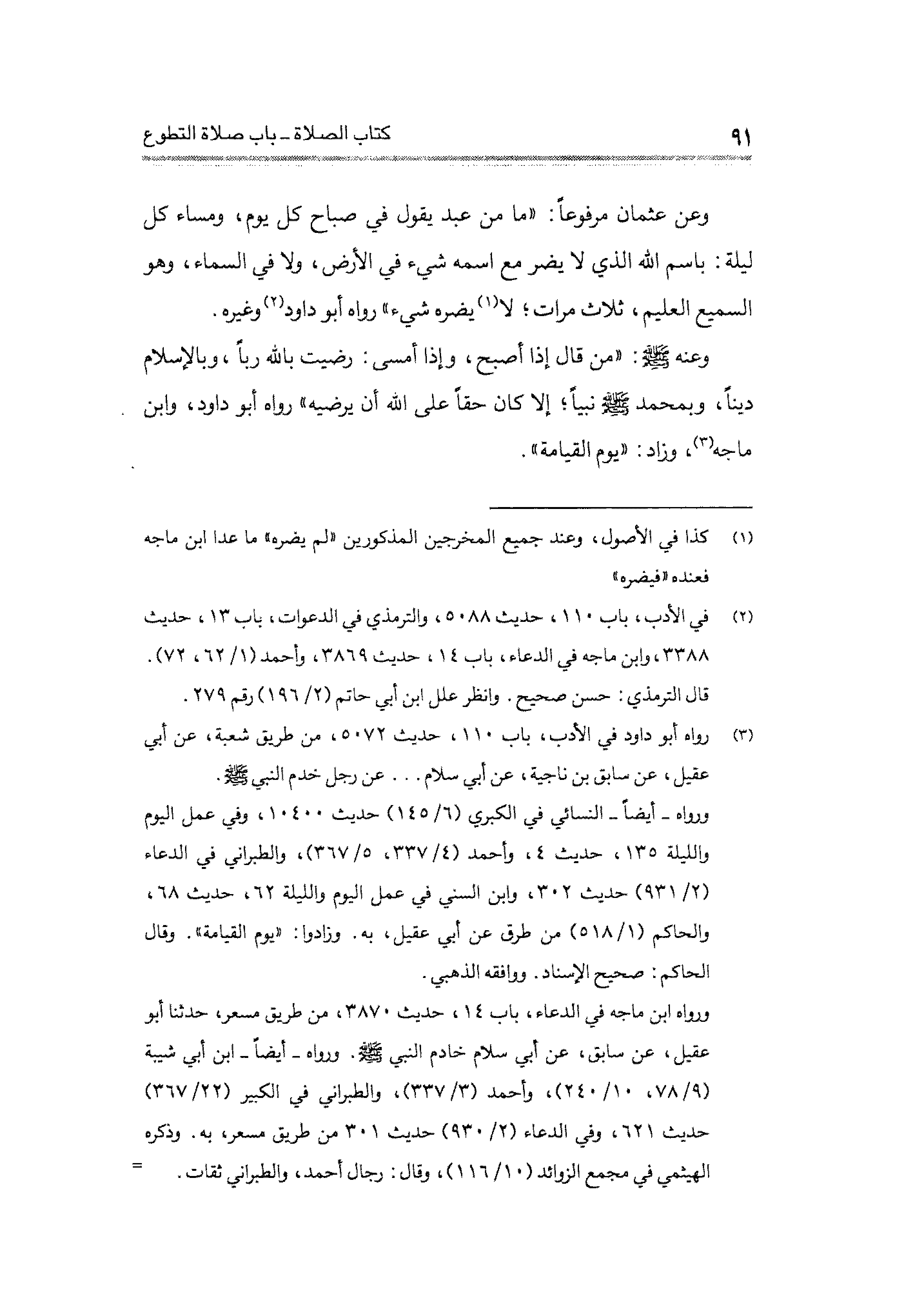 وعن عثمان مرفوعًا: "ما من عبد يقول في صباح كل يوم، ومساء كل ليلة: باسم الله الذي لا يضر مع اسمه شيء في الأرض، ولا في السماء، وهو السميع العليم، ثلاث مرات؛ لا (¬١) يضره شيء" رواه أبو داود (¬٢) وغيره.