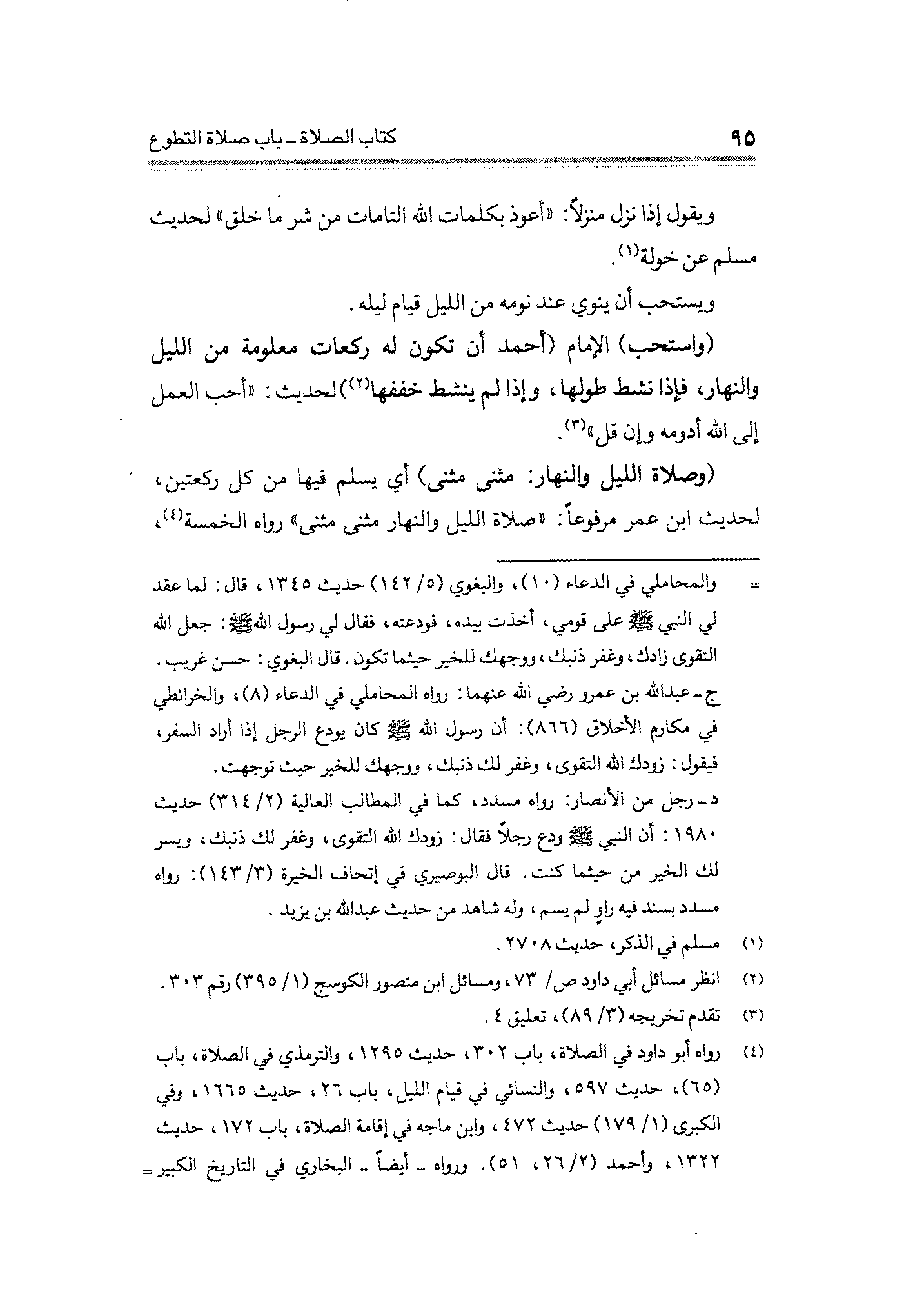 (وصلاة الليل والنهار: مثنى مثنى) أي يسلم فيها من كل ركعتين لحديث ابن عمر مرفوعًا: "صلاة الليل والنهار مثنى مثنى" رواه الخمسة (¬٤)،