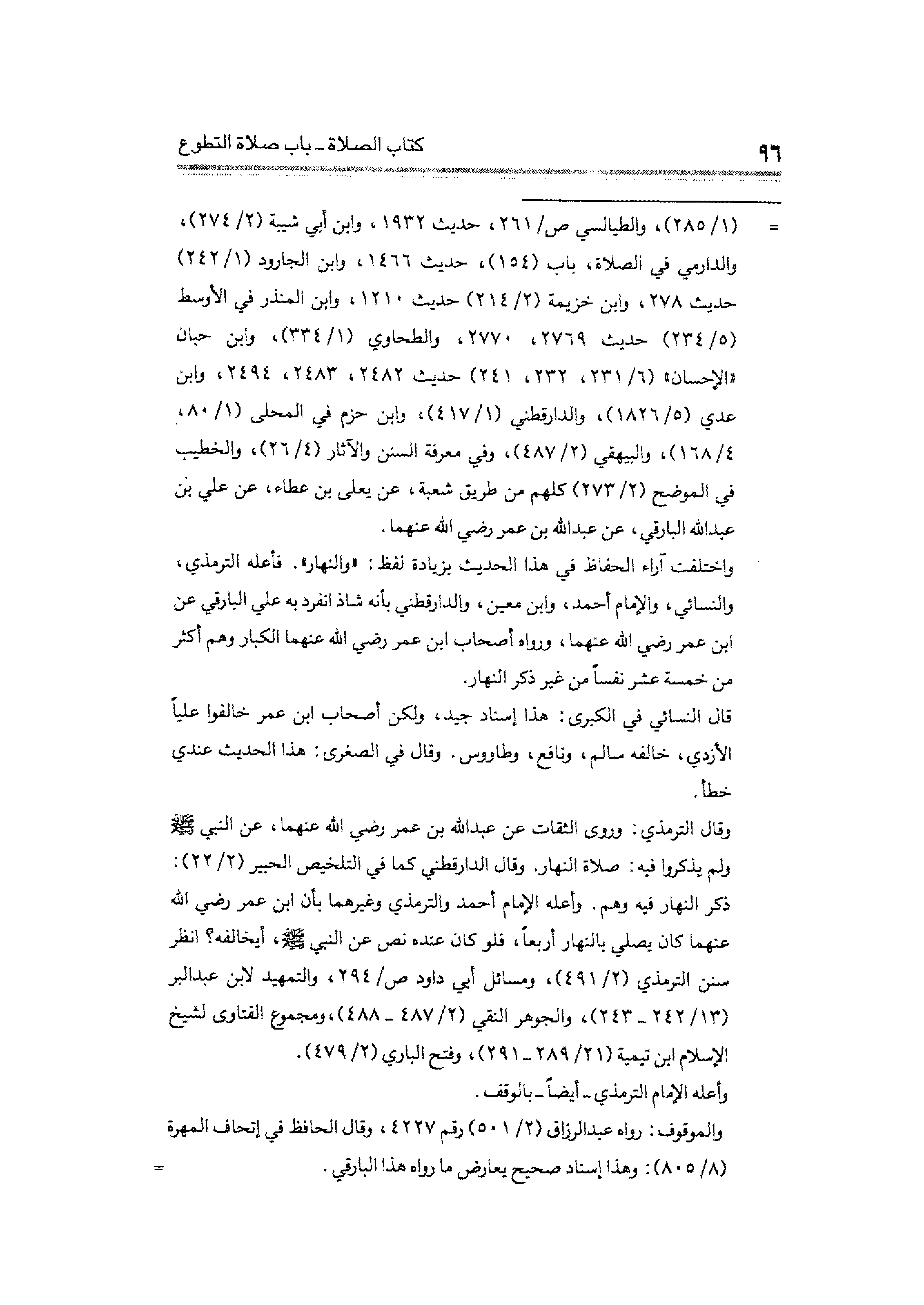 وقال الترمذى: وروى الثقات عن عبد الله بن عمر رضي الله عنهما، عن النبي - صلى الله عليه وسلم - ولم يذكروا فيه: صلاة النهار. وقال الدارقطني كما في التلخيص الحبير (٢/ ٢٢): ذكر النهار فيه وهم. وأعله الإمام أحمد والترمذي وغيرهما بأن ابن عمر رضي الله عنهما كان يصلي بالنهار أربعًا، فلو كان عنده نص عن النبي - صلى الله عليه وسلم -، أيخالفه؟ انظر. سنن الترمذي (٢/ ٤٩١)، ومسائل أبي داود ص/ ٢٩٤، والتمهيد لابن عبد البر (١٣/ ٢٤٢ - ٢٤٣)، والجوهر النقي (٢/ ٤٨٧ - ٤٨٨)، ومجموع الفتاوى لشيخ الإسلام ابن تيمية (٢١/ ٢٨٩ - ٢٩١)، وفتح الباري (٢/ ٤٧٩).