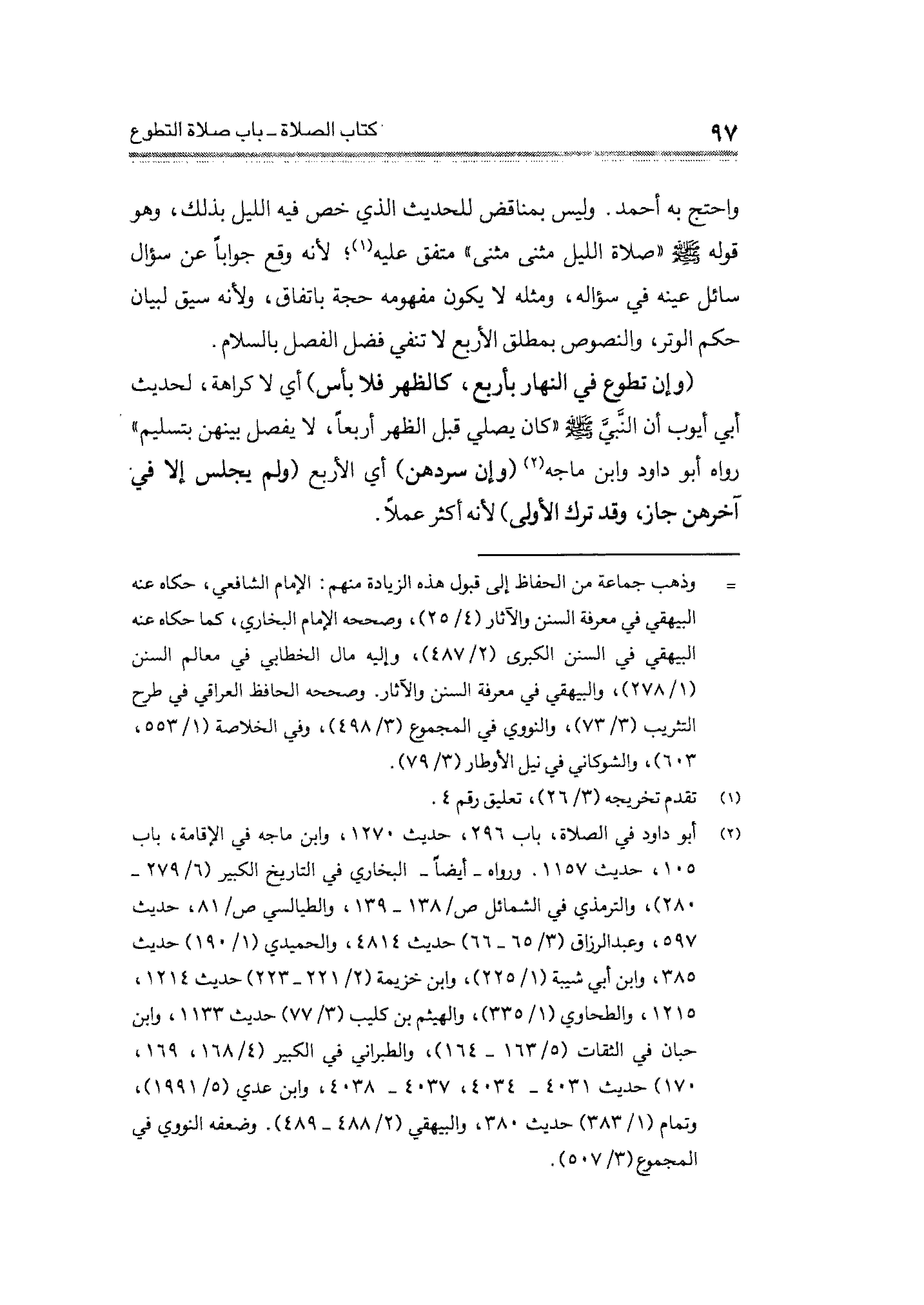 واحتج به أحمد. وليس بمناقض للحديث الذى خصي فيه الليل بذلك، وهو قوله - صلى الله عليه وسلم - صلاة الليل مثنى مثنى، متفق عليه (¬١)؛ لأنه وقع جوابًا عن سؤال سائل عنه في سؤاله، ومثله لا يكون مفهومه حجة باتفاق، ولأنه سيق لبيان حكم الوتر، والنصوص بمطلق الأربع لا تنفي فضل الفصل بالسلام.