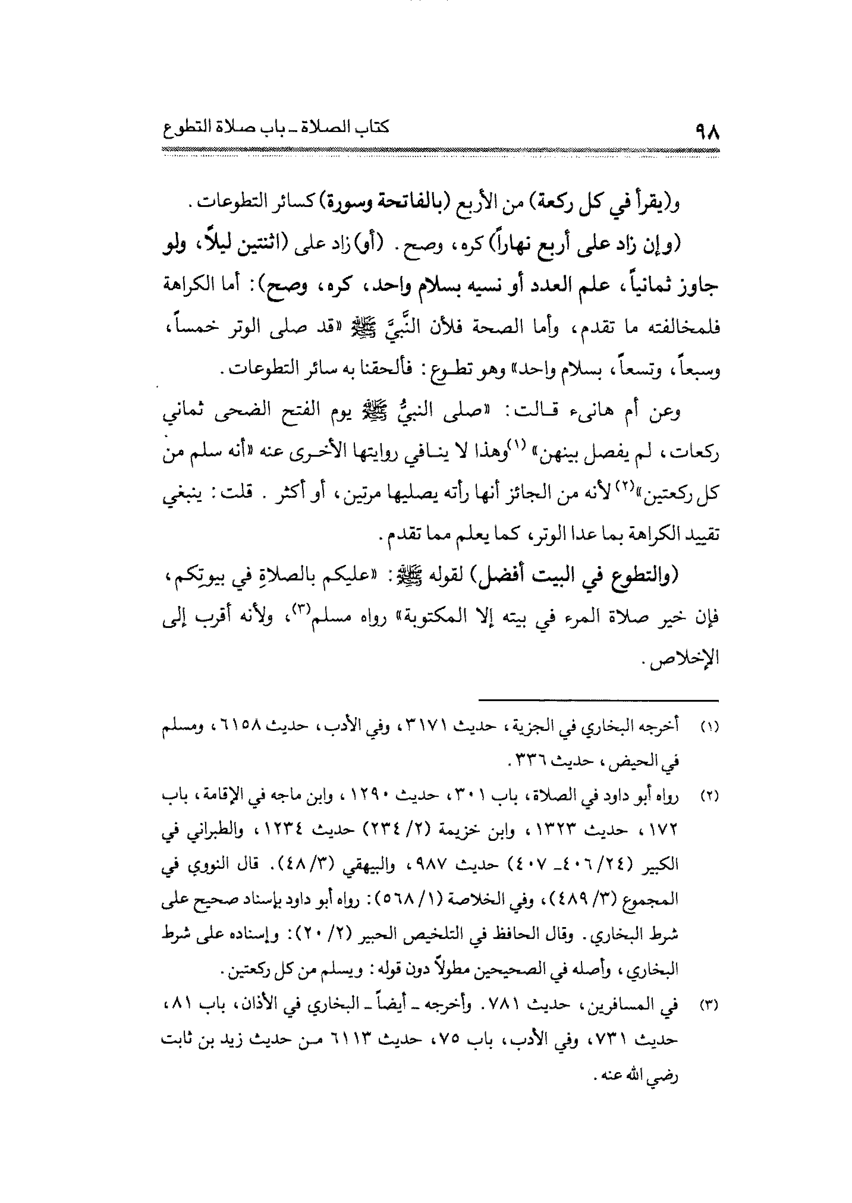 وعن أم هانئ قالت: "صلى النبي - صلى الله عليه وسلم - يوم الفتح الضحى ثماني ركعات، لم يفصل بينهن" (¬١) وهذا لا ينافي روايتها الأخرى عنه "أنه سلم من كل ركعتين" (¬٢) لأنه من الجائز أنها رأته يصليها مرتين، أو أكثر. قلت: ينبغي تقييد الكراهة بما عدا الوتر، كما يعلم مما تقدم.