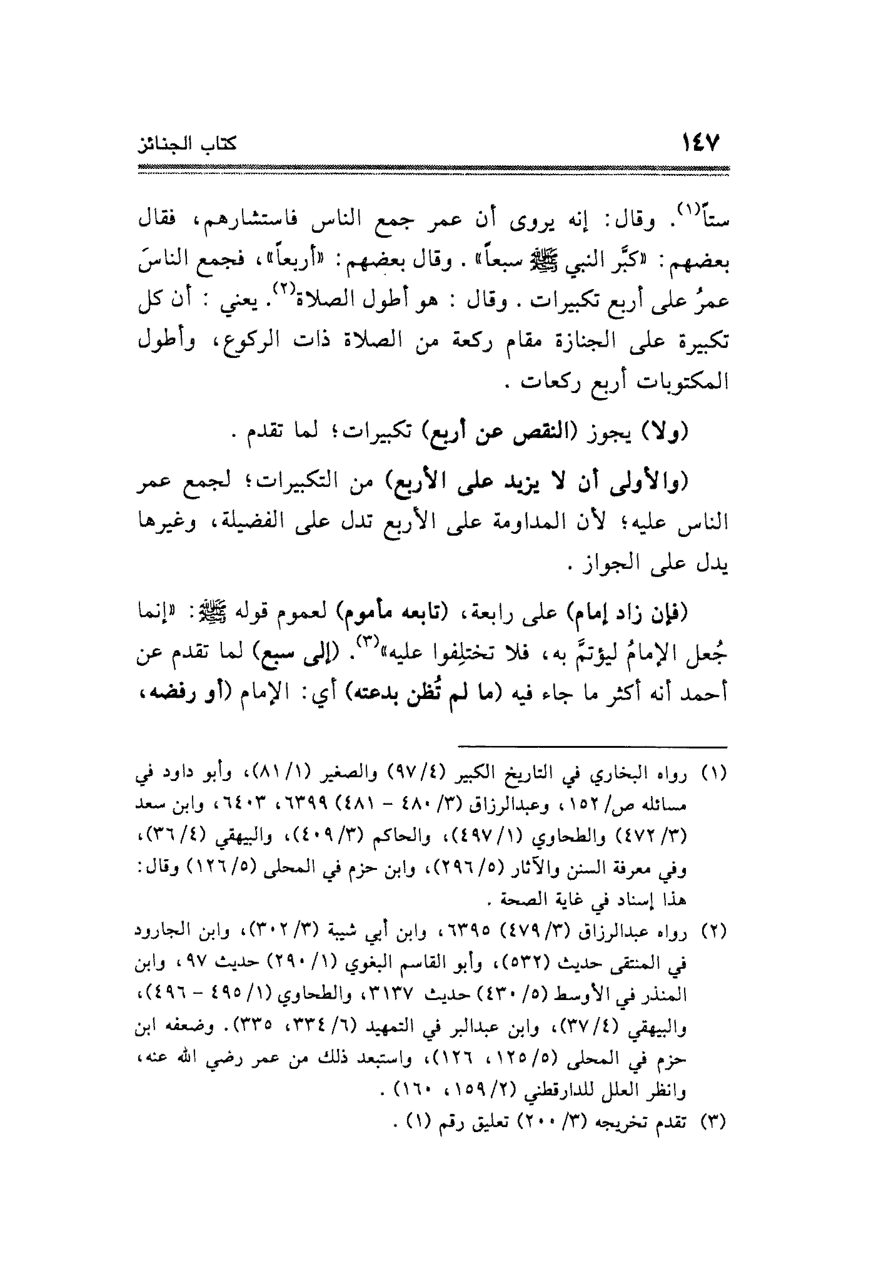 (والأولى أن لا يزيد على الأربع) من التكبيرات؛ لجمع عمر الناس عليه؛ لأن المداومة على الأربع تدل على الفضيلة، وغيرها يدل على الجواز.