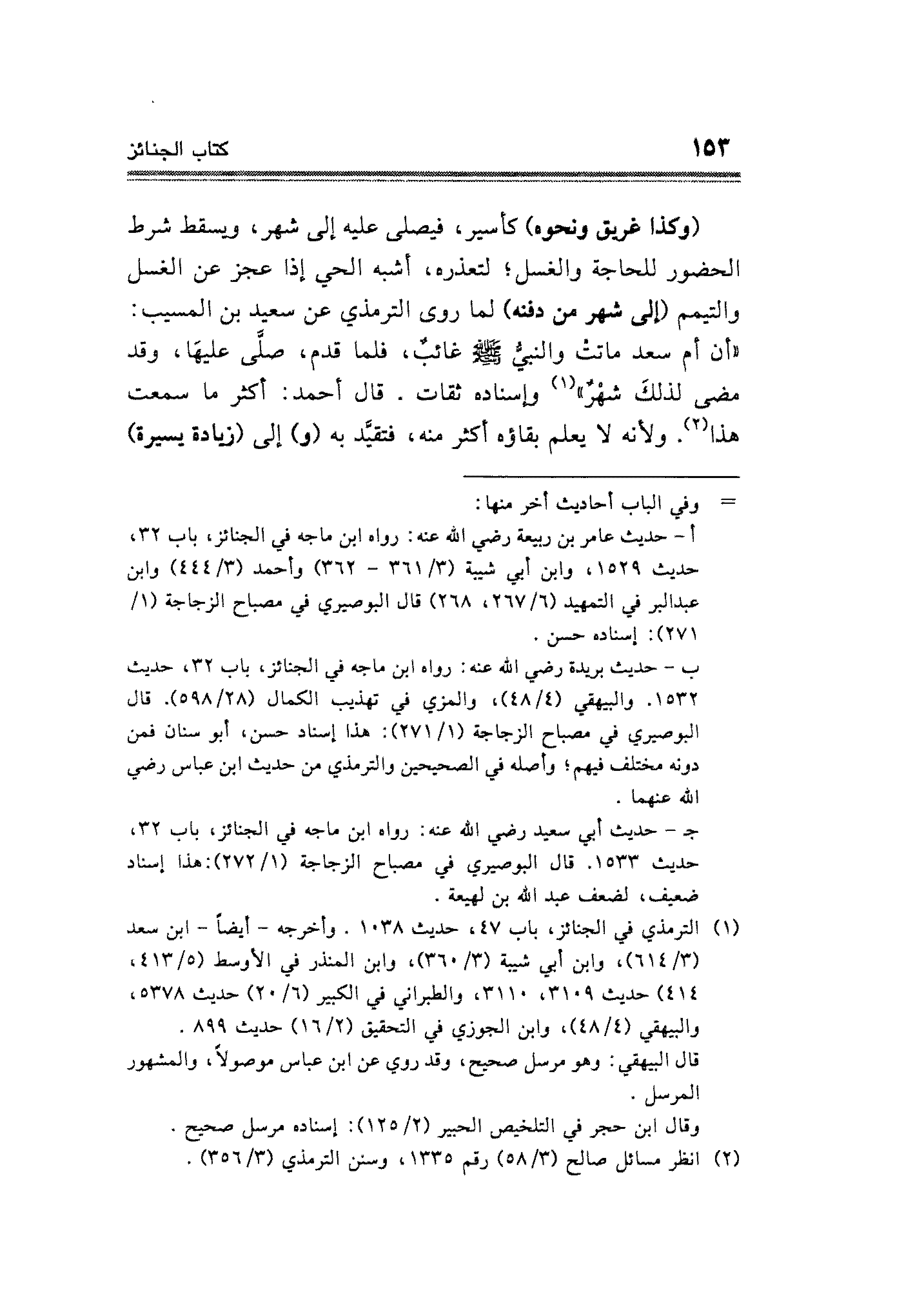 أ - حديث عامر بن ربيعة رضي الله عنه: رواه ابن ماجه في الجنائز، باب ٣٢، حديث ١٥٢٩، وابن أبي شيبة (٣/ ٣٦١ - ٣٦٢) وأحمد (٣/ ٤٤٤) وابن عبد البر في التمهيد (٦/ ٢٦٧، ٢٦٨) قال البوصيرى في مصباح الزجاجة (١/ ٢٧١): إسناده حسن.