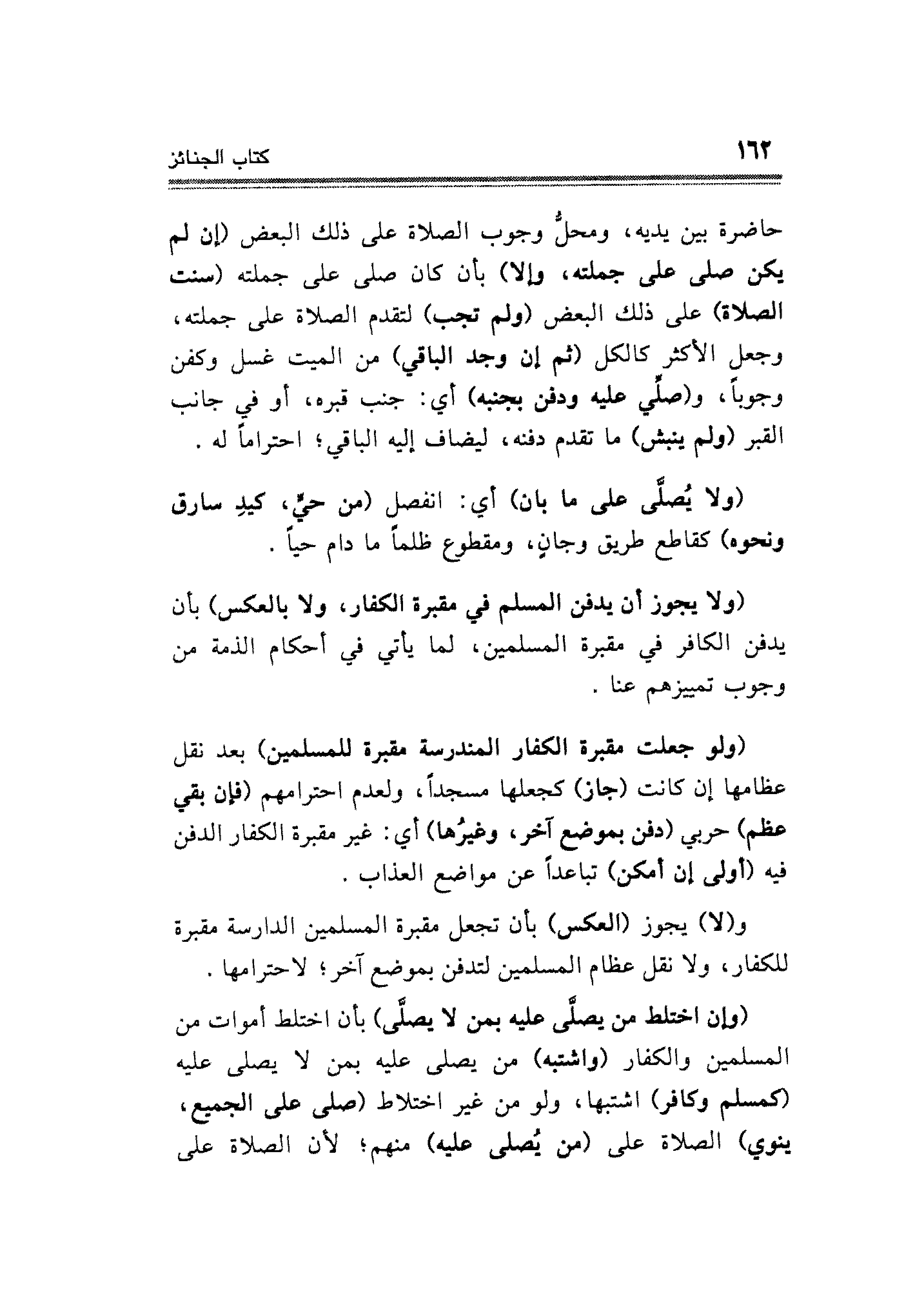 (ولا يجوز أن يدفن المسلم في مقبرة الكفار، ولا بالعكس) بأن يدفن الكافر في مقبرة المسلمين؛ لما يأتي في أحكام الذمة من وجوب تمييزهم عنا.