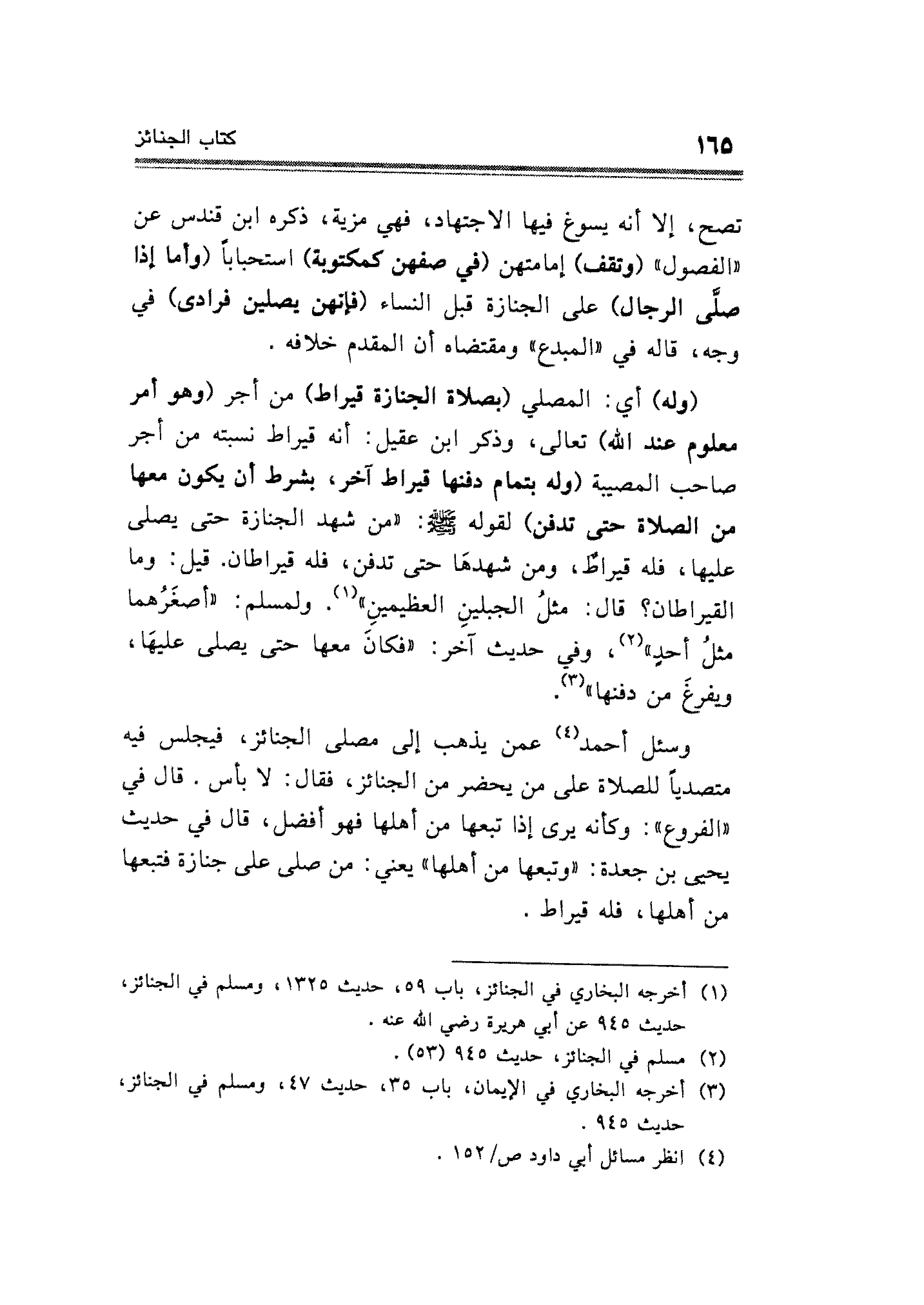 (وله) أي: المصلى (بصلاة الجنازة قيراط) من أجر (وهو أمر معلوم عند الله تعالى، وذكر ابن عقيل: أنه قيراط نسبته من أجر صاحب المصيبة (وله بتمام دفنها قيراط آخر، بشرط أن يكون معها من الصلاة حتى تدفن) لقوله: - صلى الله عليه وسلم - من شهد الجنازة حتى يصلى عليها، فله قيراط، ومن شهدهَا حتى تدفن، فله قيراطان. قيل: وما القيراطان؟ قال: مثلُ الجبلينِ العظيمينِ) (¬١). ولمسلم: "أصغَرُهما مثلُ أحدٍ" (¬٢)، وفي حديث آخر: "فكانَ معها حتى يصلى عليهَا، ويفرخَ من دفنها" (¬٣).