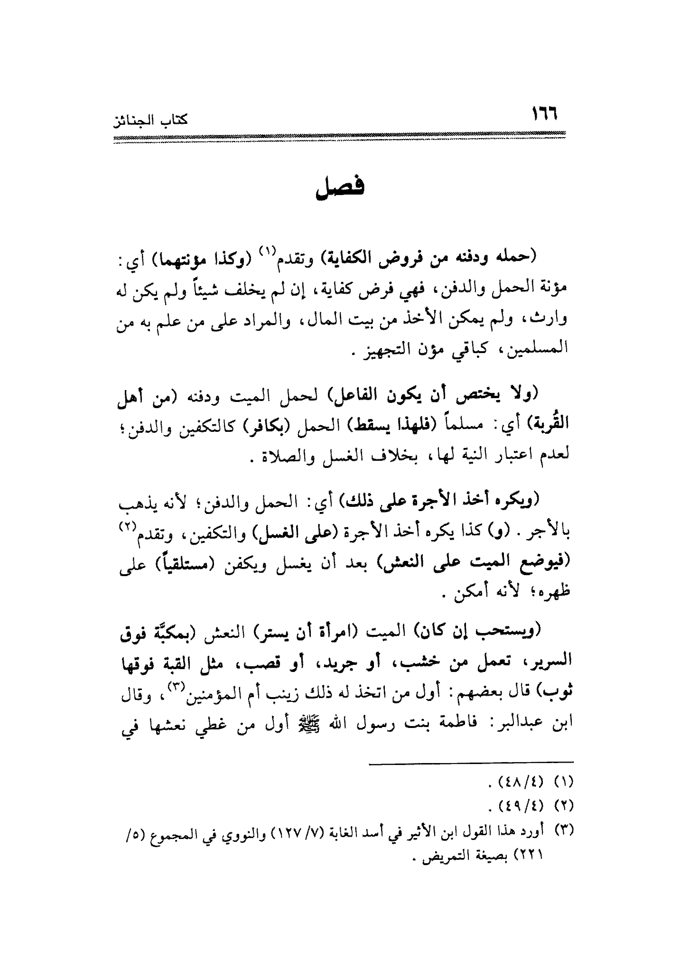 (ولا يختص أن يكون الفاعل) لحمل الميت ودفنه (من أهل القُربة) أي: مسلمًا (فلهذا يسقط) الحمل (بكافر) كالتكفين والدفن؛ لعدم اعتبار النية لها، بخلاف الغسل والصلاة.