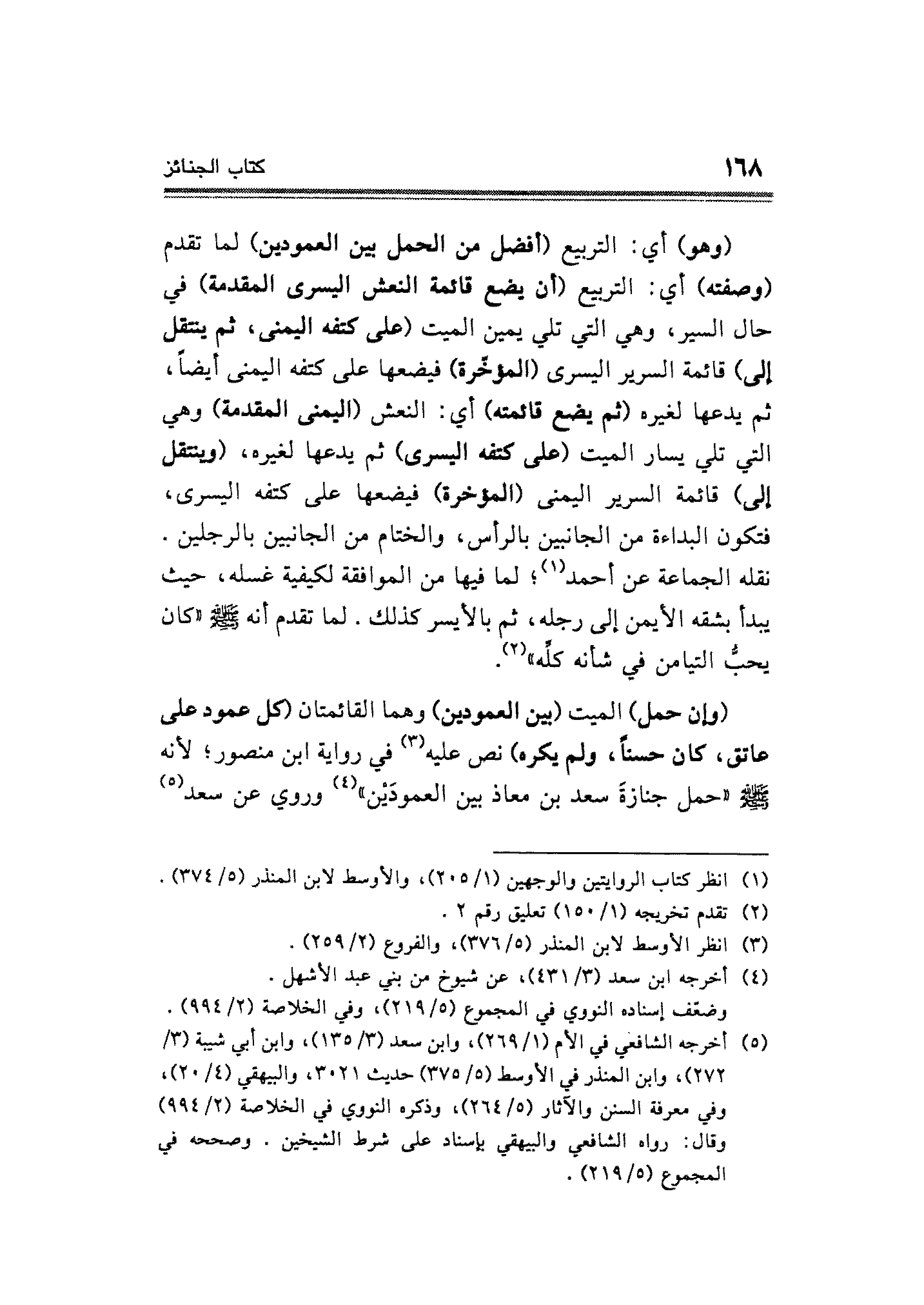 (وإن حمل) الميت (بين العمودين) وهما القائمتان (كل عمود على عاتق، كان حسنًا، ولم يكره) نص عليه (¬٣) في رواية ابن منصور؛ لأنه - صلى الله عليه وسلم - "حمل جنازةً سعد بن معاذ بين العمودَين" (¬٤) وروي عن سعد (¬٥)