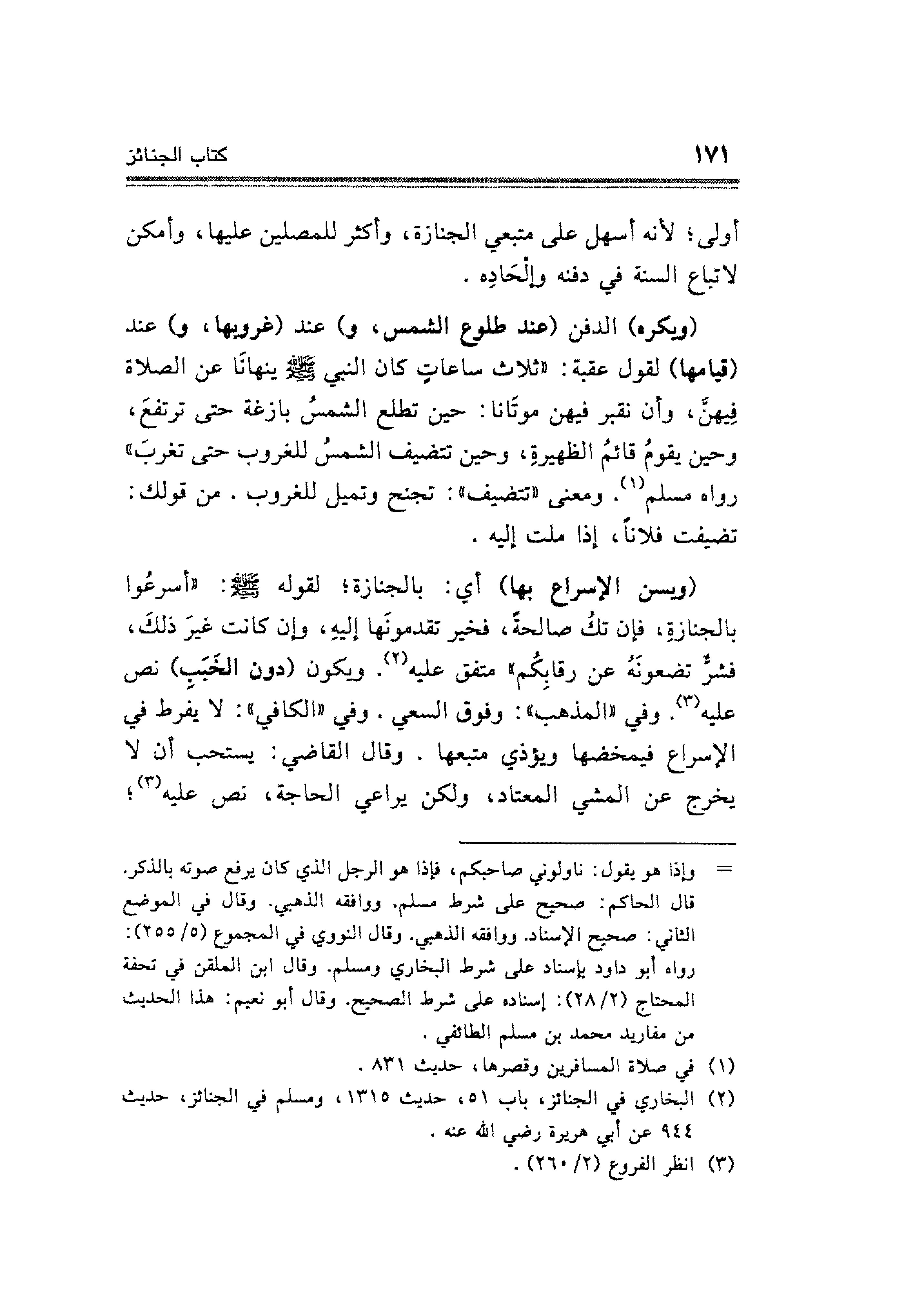 (ويكره) الدفن (عند طلوع الشمس، و) عند (غروبها، و) عند (قيامها) لقول عقبة: "ثلاث ساعاتٍ كان النبي - صلى الله عليه وسلم - ينهانَا عن الصلاة فيهن، وأن نقبر فيهن موتَانا: حين تطلع الشمسُ بازغة حتَّى ترتفعَ، وحين يقومُ قائمُ الظهيرةِ، وحين تتضيف الشمسُ للغروب حتَّى تغربَ" رواه مسلم (¬١). ومعنى "تتضيف": تجنح وتميل للغروب. من قولك: تضيفت فلانًا، إذا ملت إليه.