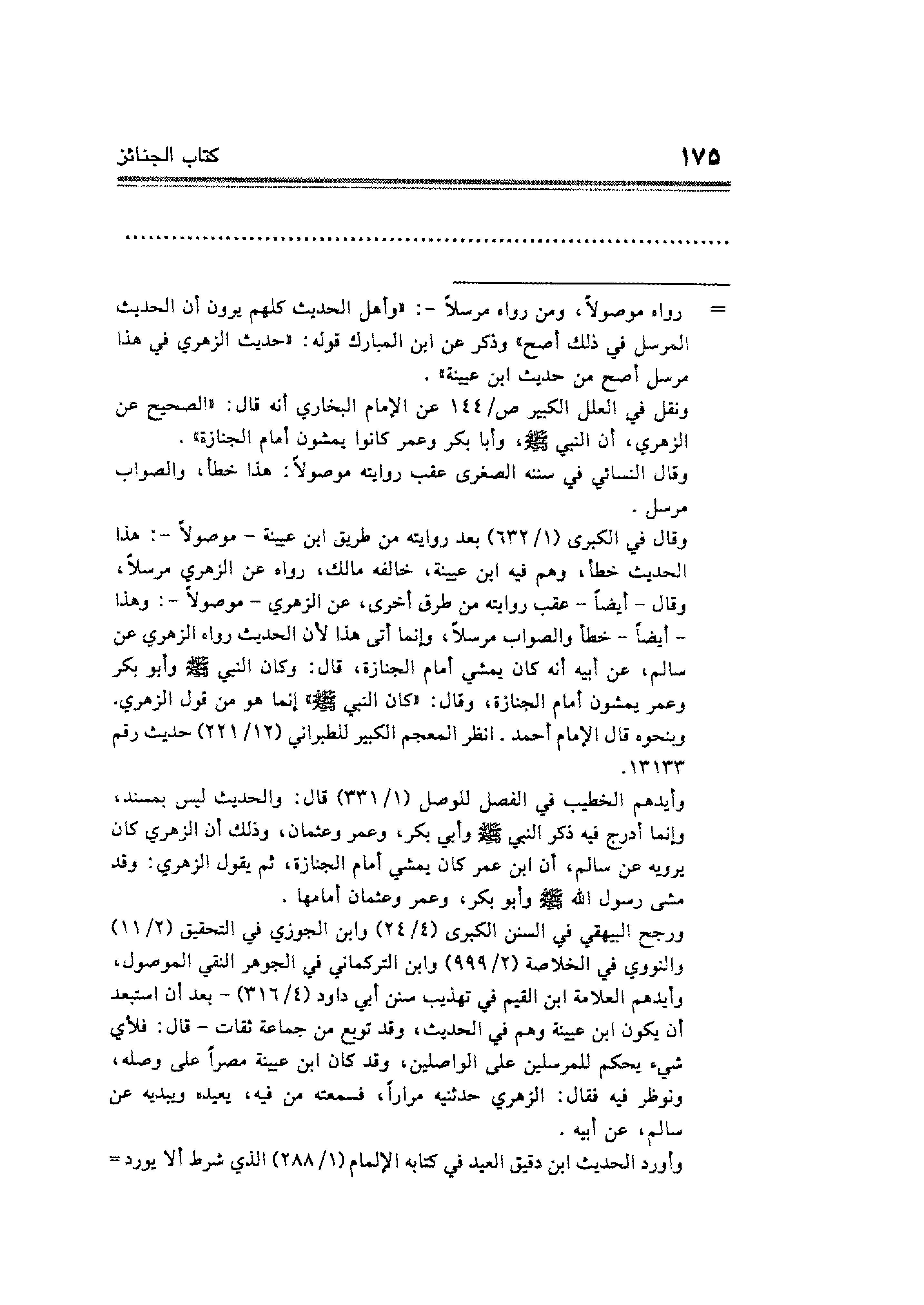 وقال في الكبرى (١/ ٦٣٢) بعد روايته من طريق ابن عيينة - موصولًا -: هذا الحديث خطأ، وهم فيه ابن عيينة، خالفه مالك، رواه عن الزهري مرسلًا، وقال - أيضًا - عقب رواته من طرق أخرى، عن الزهري موصولًا -: وهذا - أيضًا - خطأ والصواب مرسلًا، وإنما أتى هذا لأن الحديث رواه الزهري عن سالم، عن أبيه أنه كان يمشي أمام الجنازة، قال: وكان النبي - صلى الله عليه وسلم - وأبو بكر وعمر يمشون أمام الجنازة، وقال: "كان النبي - صلى الله عليه وسلم -" إنما هو من قول الزهري. وبنحوه قال الإمام أحمد. انظر المعجم الكبير للطبراني (١٢/ ٢٢١) حديث رقم ١٣١٣٣.