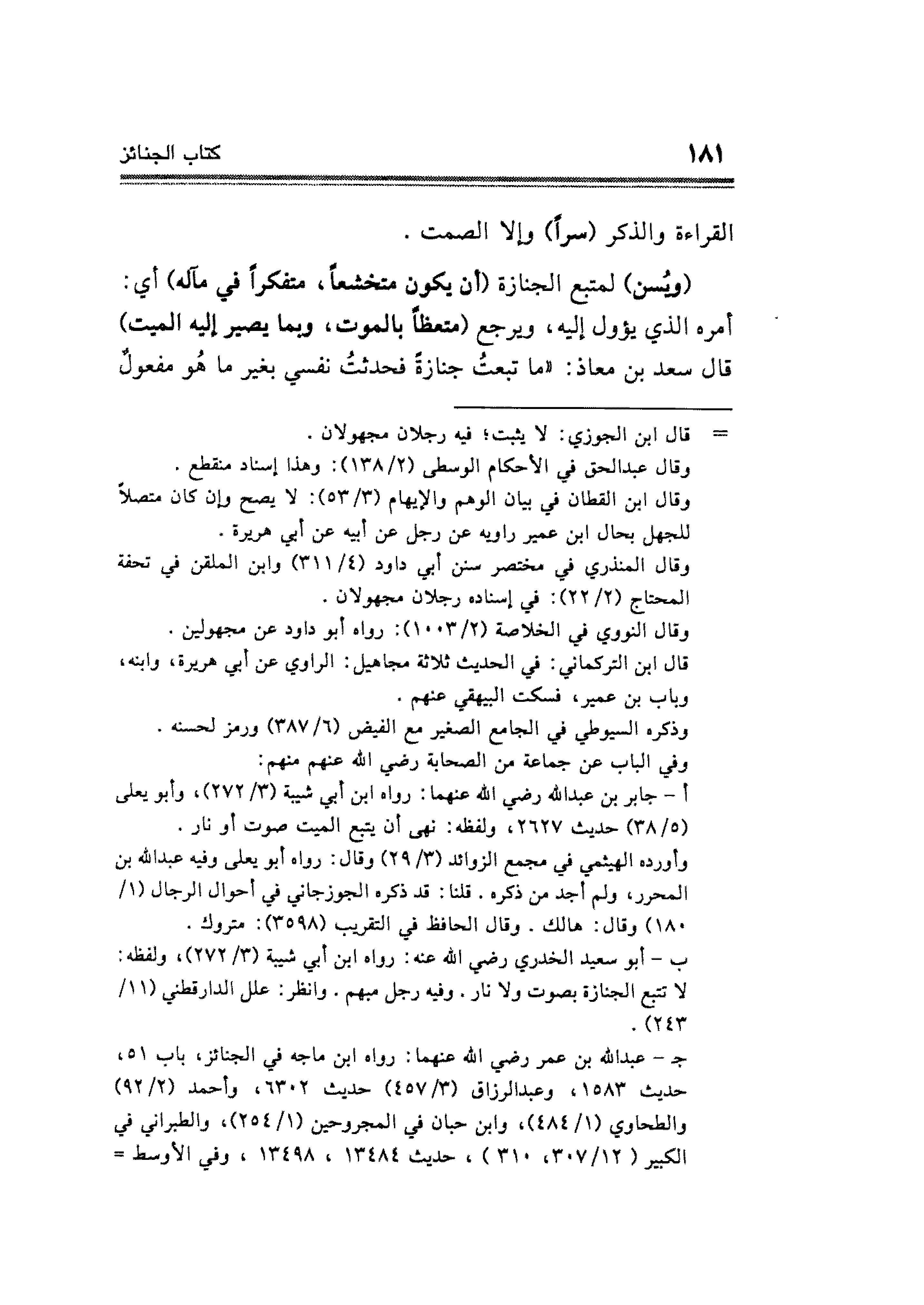 جـ - عبد الله بن عمر رضي الله عنهما: رواه ابن ماجه في الجنائز، باب ٥١، حديث ١٥٨٣، وعبد الرزاق (٣/ ٤٥٧) حديث ٦٣٠٢، وأحمد (٢/ ٩٢) والطحاوي (١/ ٤٨٤)، وابن حبان في المجروحين (١/ ٢٥٤)، والطبراني في الكبير (١٢/ ٣٠٧، ٣١٠)، حديث ١٣٤٨٤، ١٣٤٩٨، وفي الأوسط =