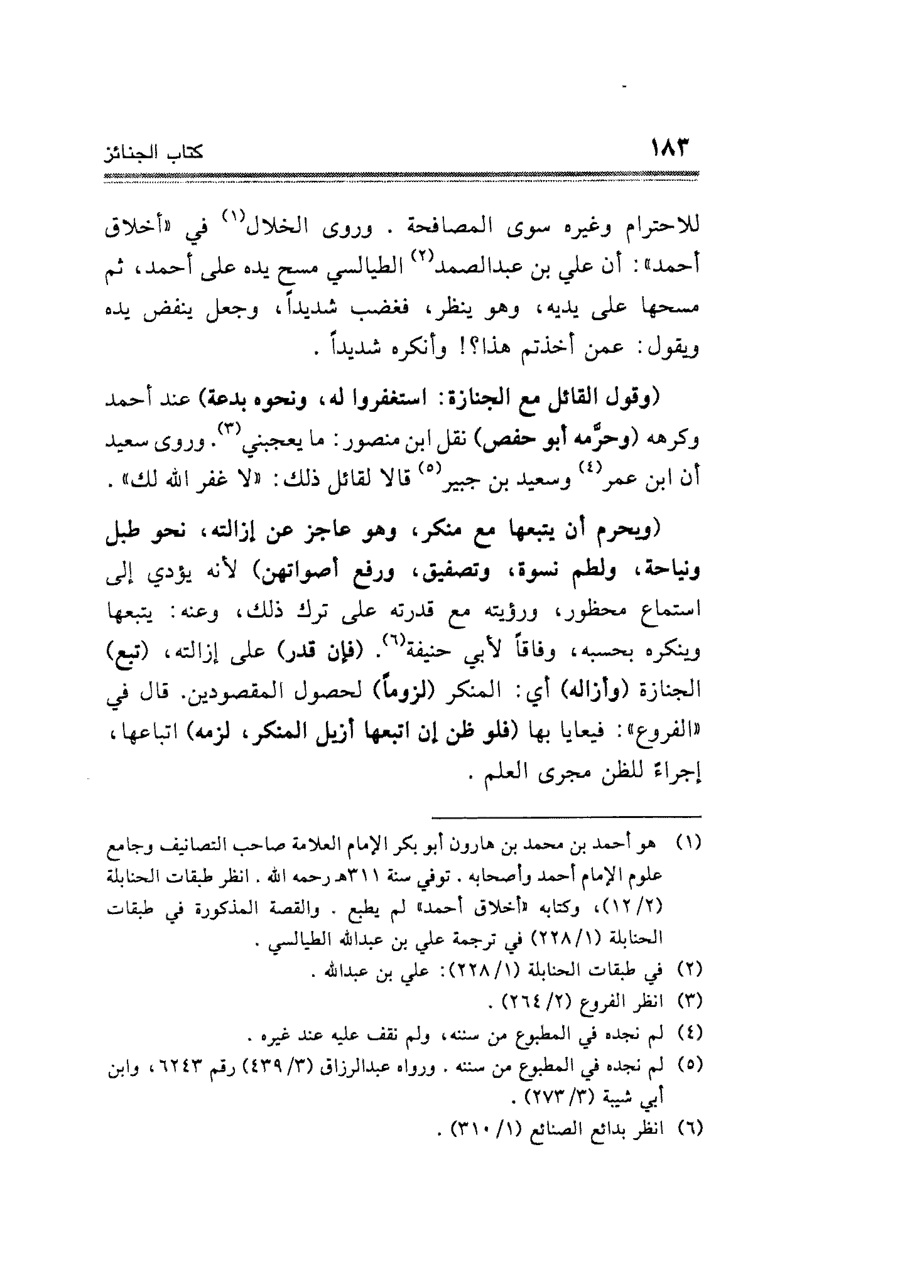 (¬١) هو أحمد بن محمد بن هارون أبو بكر الإمام العلامة صاحب التصانيف وجامع علوم الإمام أحمد وأصحابه. توفي سنة ٣١١ هـ رحمه الله. انظر طبقات الحنابلة (٢/ ١٢)، وكتابه "أخلاق أحمد" لم يطبع. والقصة المذكورة في طبقات الحنابلة (١/ ٢٢٨) في ترجمة علي بن عبد الله الطيالسي.