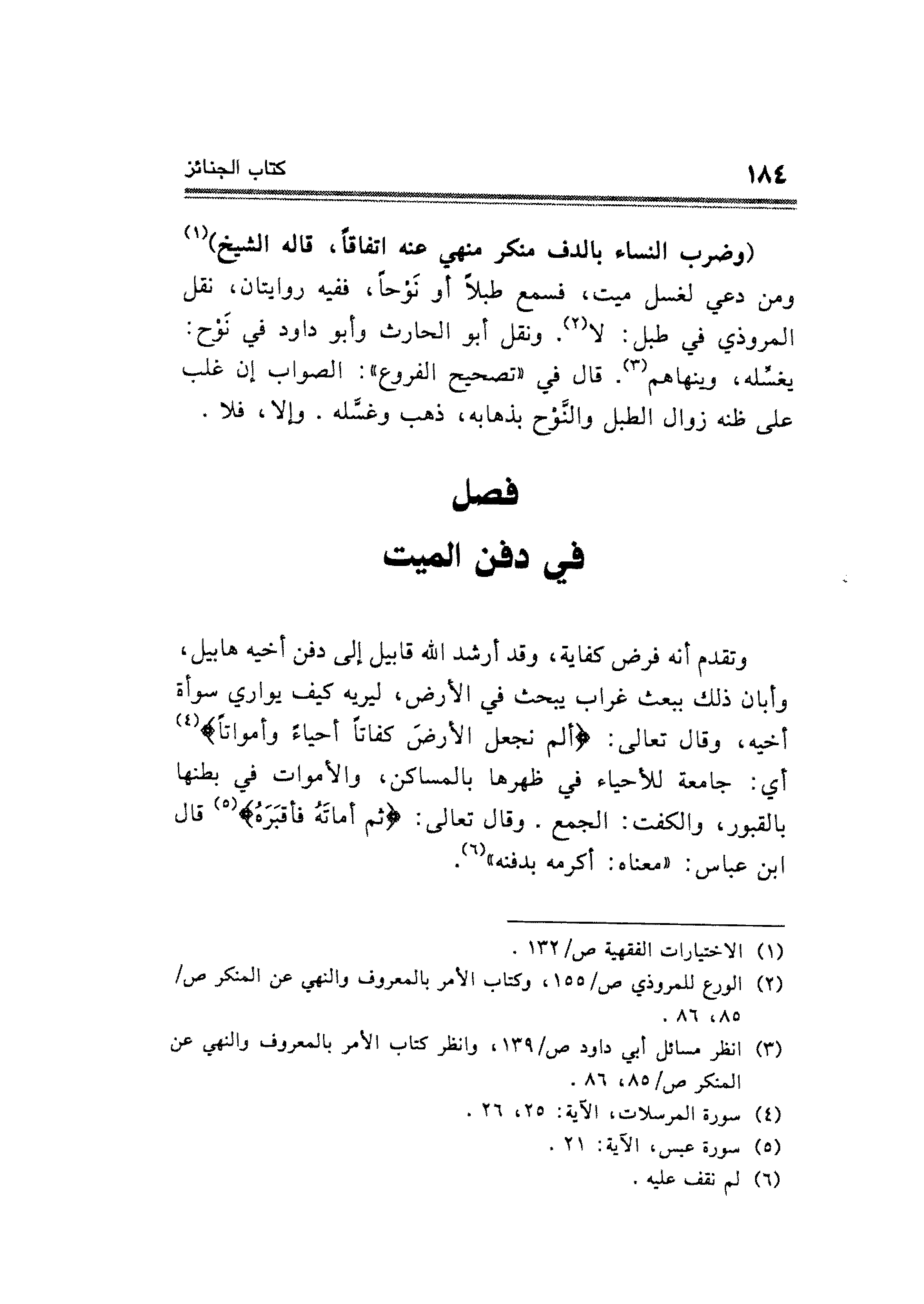 وتقدم أنه فرض كفاية، وقد أرشد الله قابيل إلى دفن أخيه هابيل، وأبان ذلك ببعث غراب يبحث في الأرض؛ ليريه كيف يواري سوأة أخيه، وقال تعالى: {أَلَمْ نَجْعَلِ الْأَرْضَ كِفَاتًا أَحْيَاءً وَأَمْوَاتًا} (¬٤) أي: جامعة للأحياء في ظهرها بالمساكن، والأموات في بطنها بالقبور، والكفت: الجمع. وقال تعالى: {ثُمَّ أَمَاتَهُ فَأَقْبَرَهُ} (¬٥) قال ابن عباس: "معناه: أكرمه بدفنه" (¬٦).