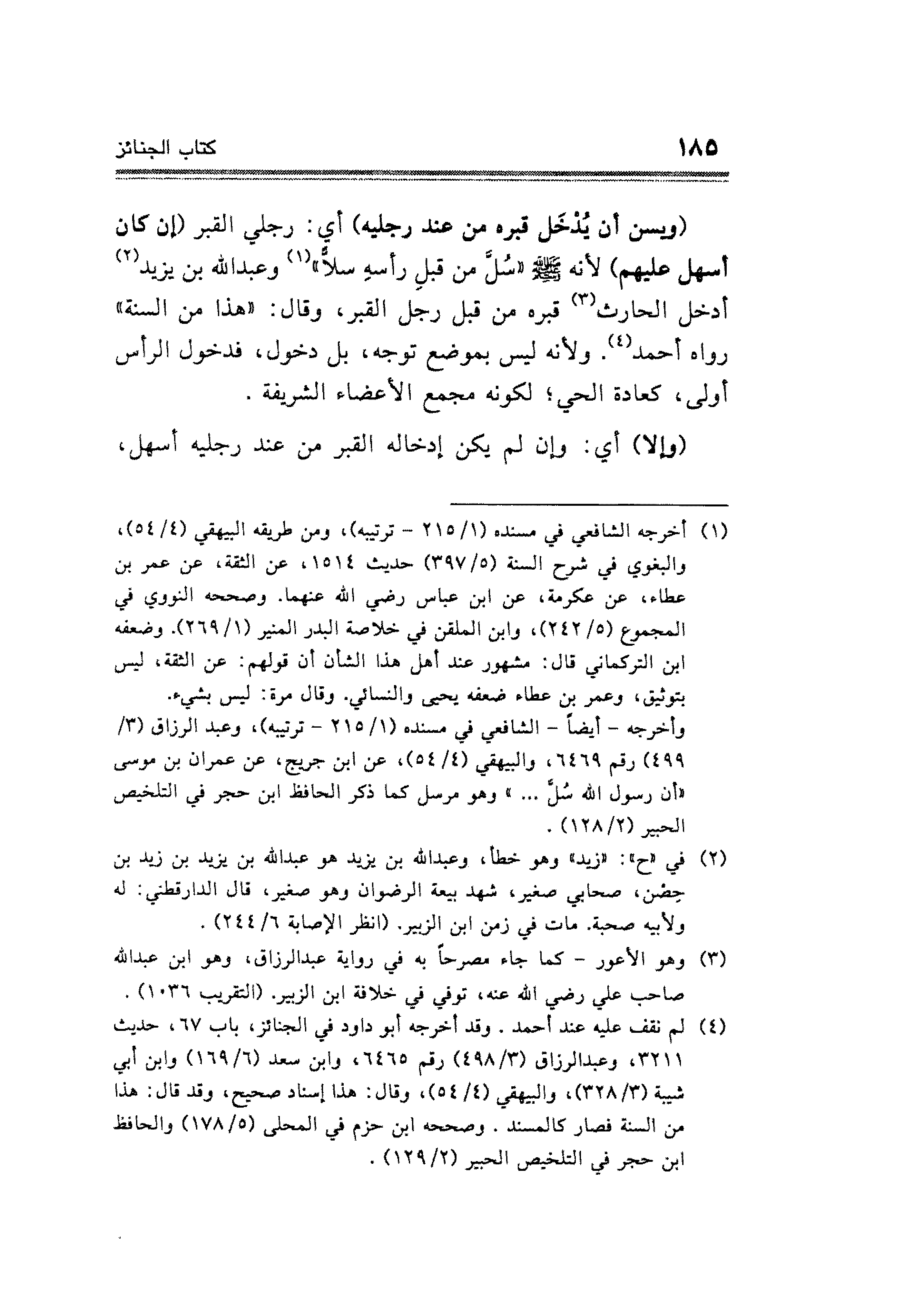 (ويسن أن يُدْخَل قبره من عند رجليه) أي: رجلي القبر (إن كان أسهل عليهم) لأنه - صلى الله عليه وسلم - "سُلَّ من قبلِ رأسهِ سلاًّ" (¬١) وعبد الله بن يزيد (¬٢) أدخل الحارث (¬٣) قبره من قبل رجل القبر، وقال: "هذا من السنة" رواه أحمد (¬٤). ولأنه ليس بموضع توجه، بل دخول، فدخول الرأس أولى، كعادة الحي؛ لكونه مجمع الأعضاء الشريفة.