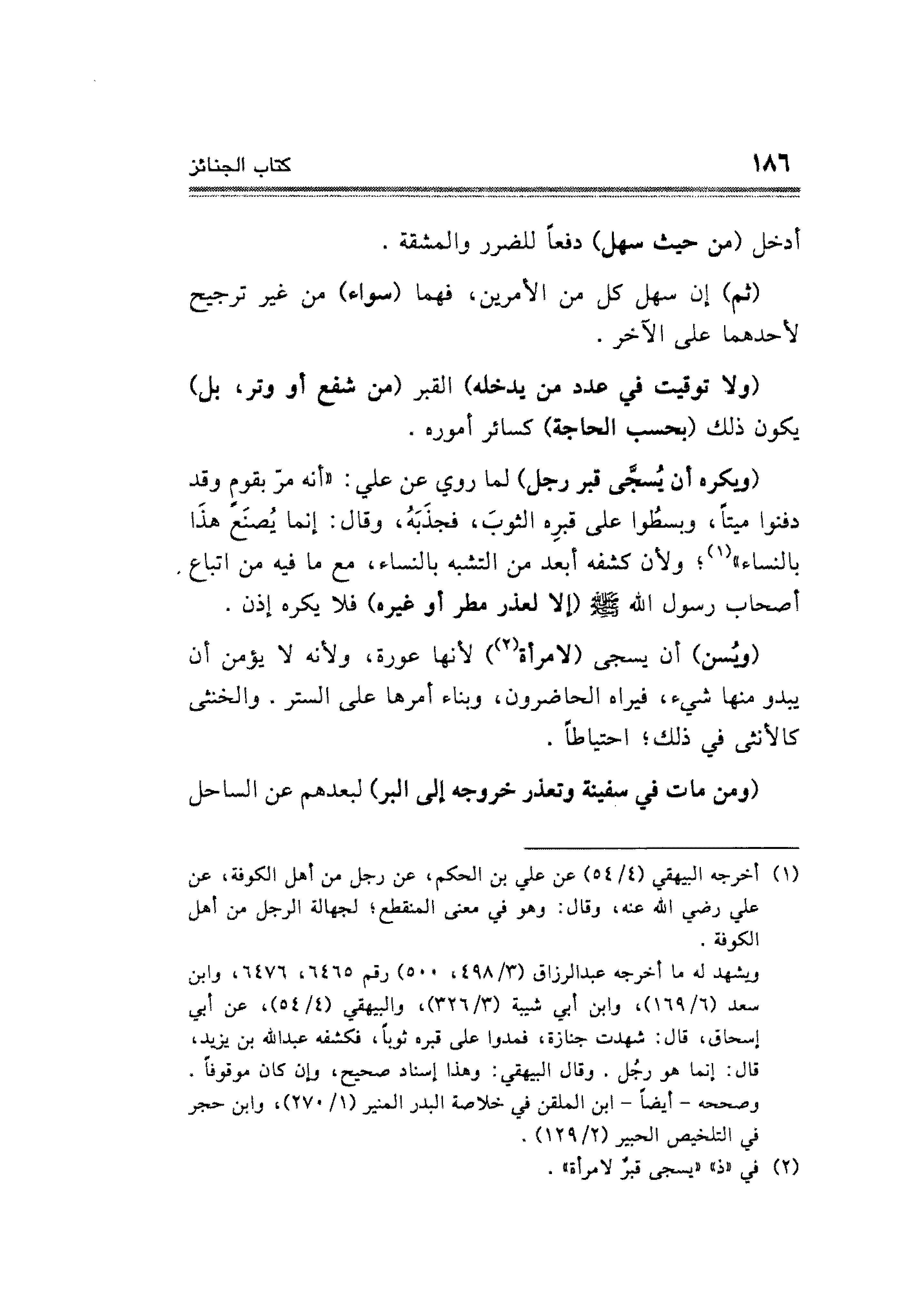 (ويكره أن يُسجَّى قبر رجل) لما روي عن علي: "أنه مرّ بقومٍ وقد دفنوا ميتاً، وبسطُوا على قبرِه الثوبَ، فجذَبَهُ، وقال: إنما يُصنَع هذَا بالنساء" (¬١)، ولأن كشفه أبعد من التشبه بالنساء، مع ما فيه من اتباع أصحاب رسول الله - صلى الله عليه وسلم - (إلا لعذر مطر أو غيره) فلا يكره إذن.