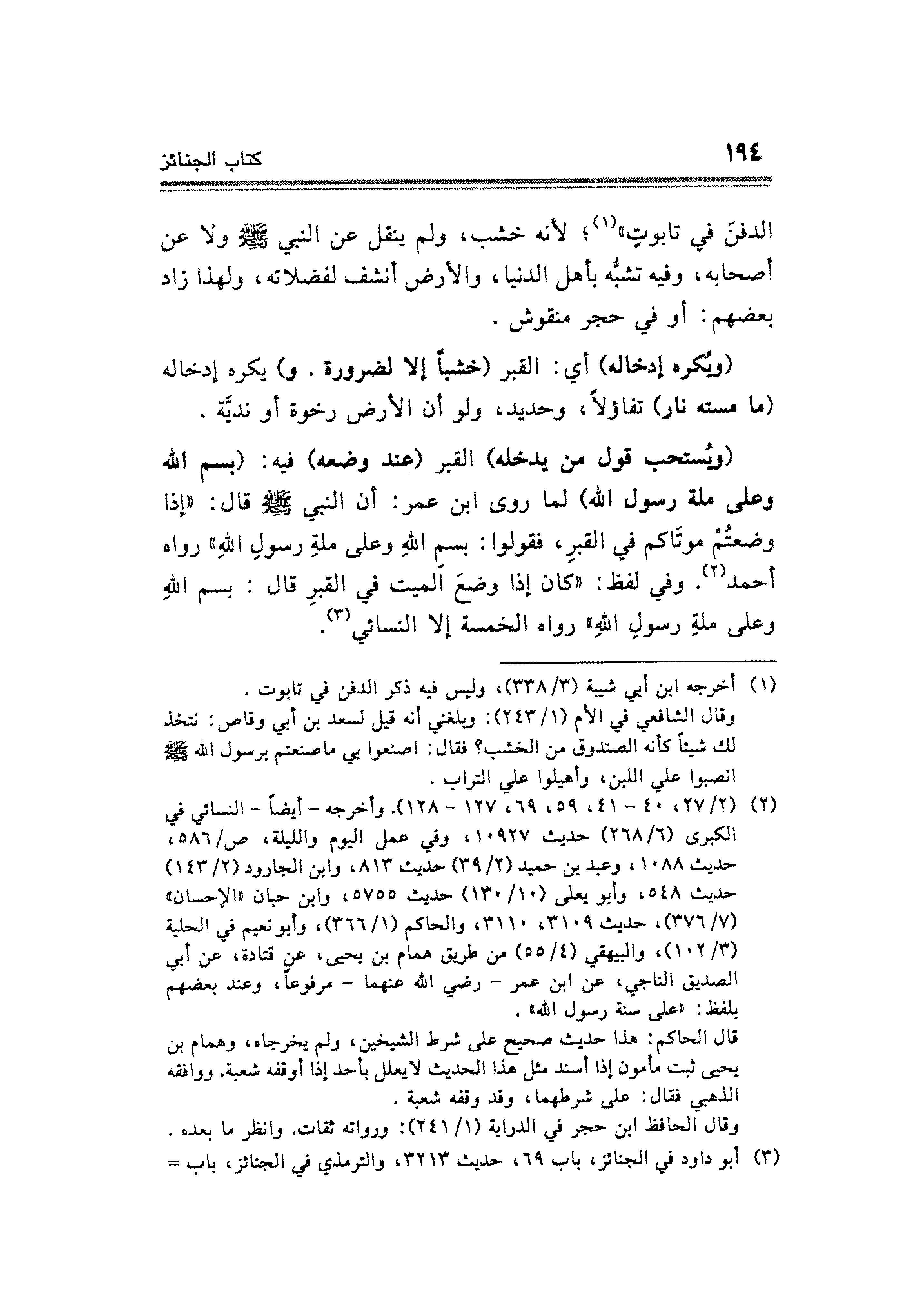 الدفنَ في تابوتٍ" (¬١)؛ لأنه خشب، ولم ينقل عن النبي - صلى الله عليه وسلم - ولا عن أصحابه، وفيه تشبُّه بأهل الدنيا، والأرض أنشف لفضلاته، ولهذا زاد بعضهم: أو في حجر منقوش.